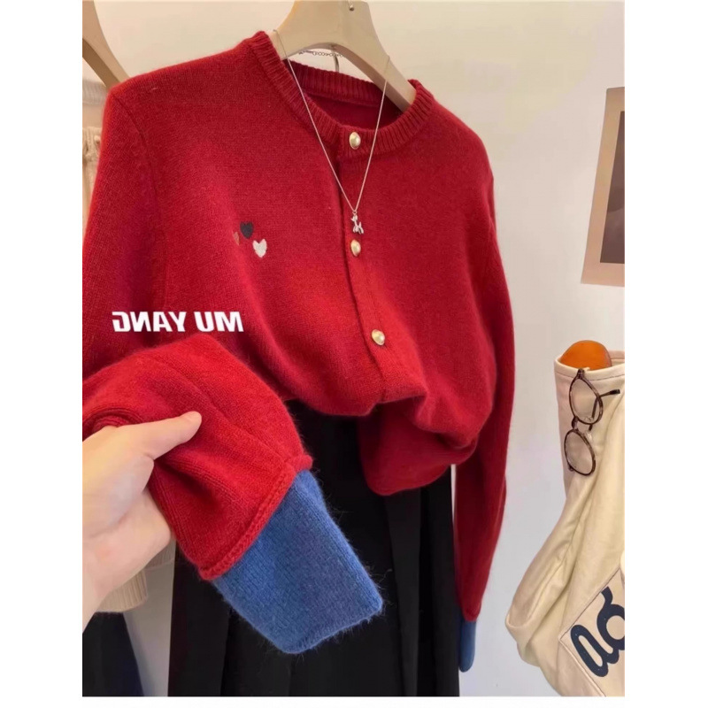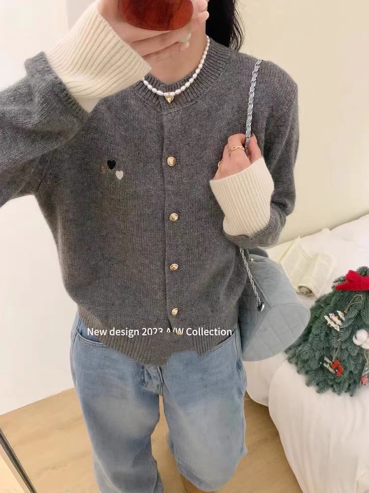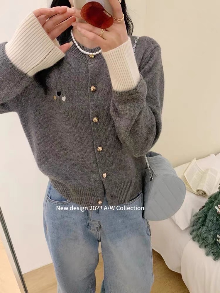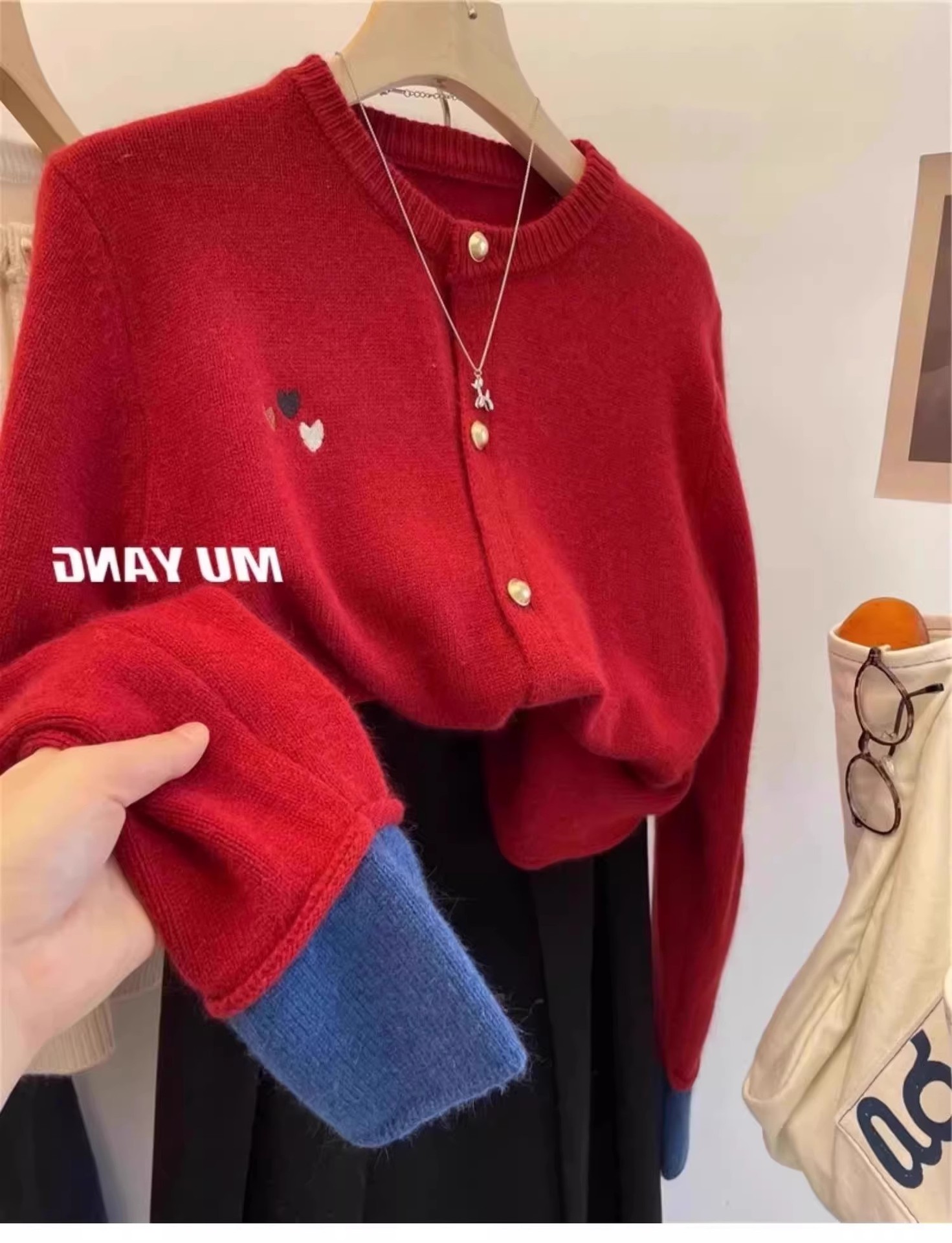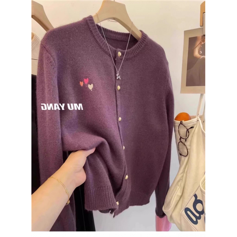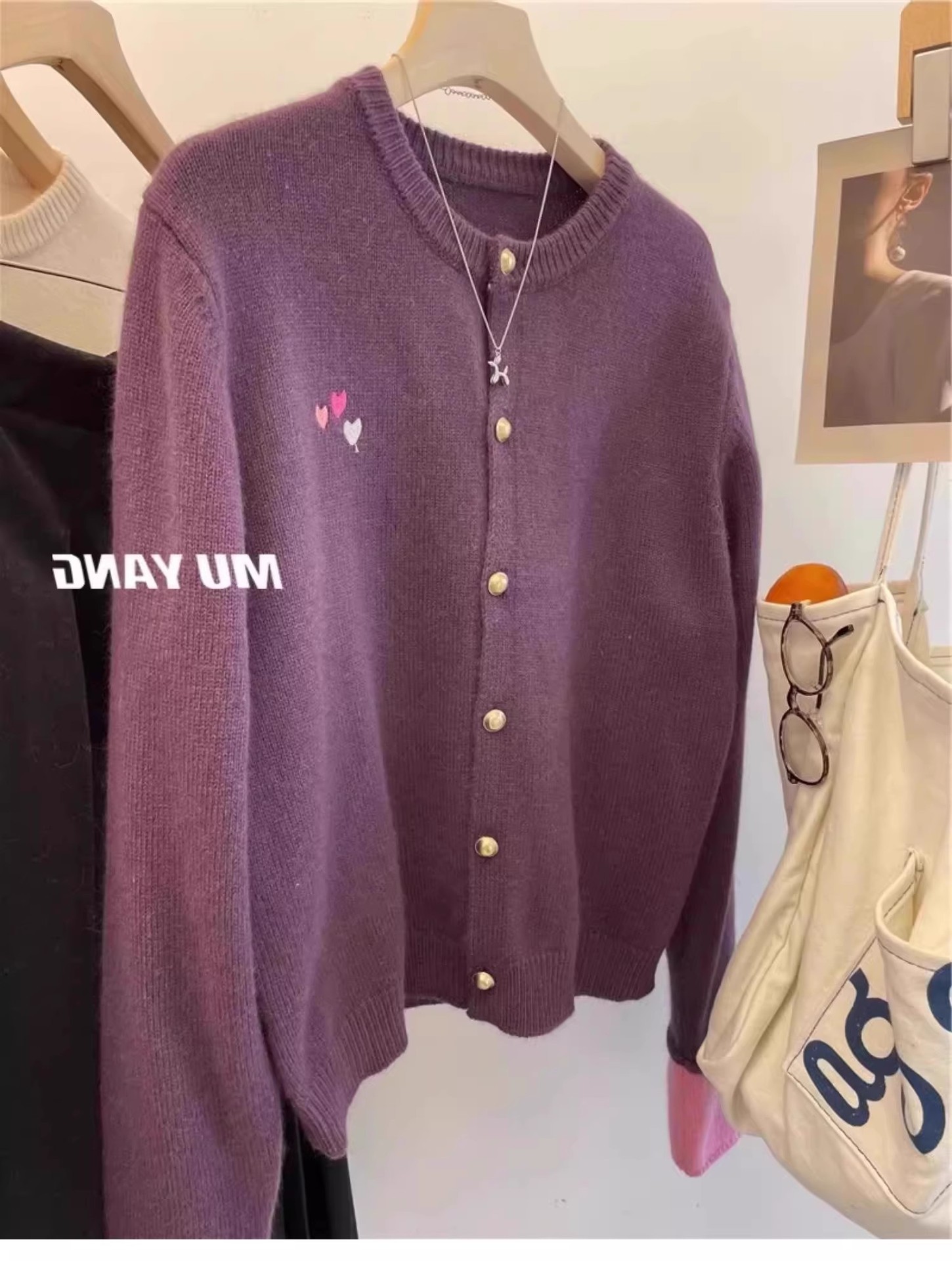 한국 스타일 사랑 자수 둥근 목 니트 카디건 여자 가을 겨울 느슨한 올매치 니트 스웨터 베이스 코트 캐시미어