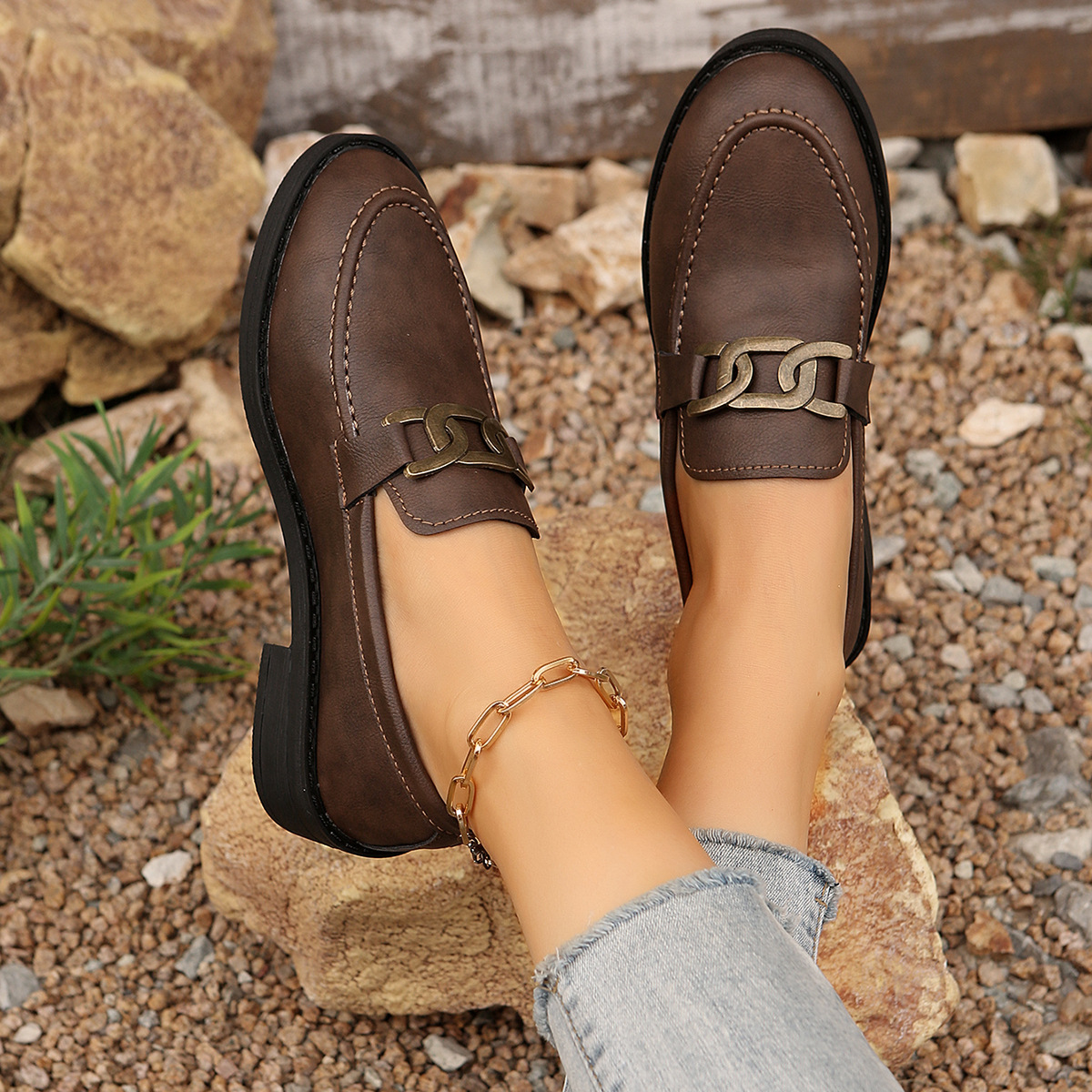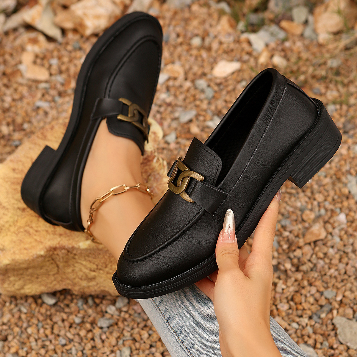 2025 봄과 가을 새로운 스타일 스퀘어 힐 로우 힐 메탈 버클 여성 싱글 신발 영국 라운드 발가락 로퍼 프렌치 여성용 작은 가죽 신발