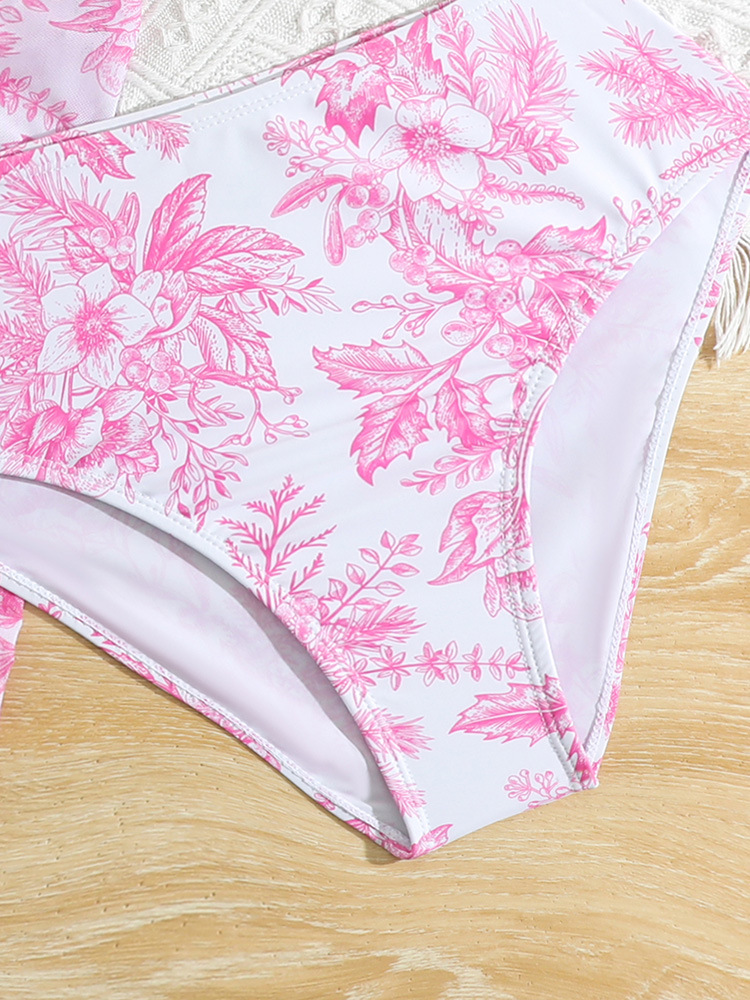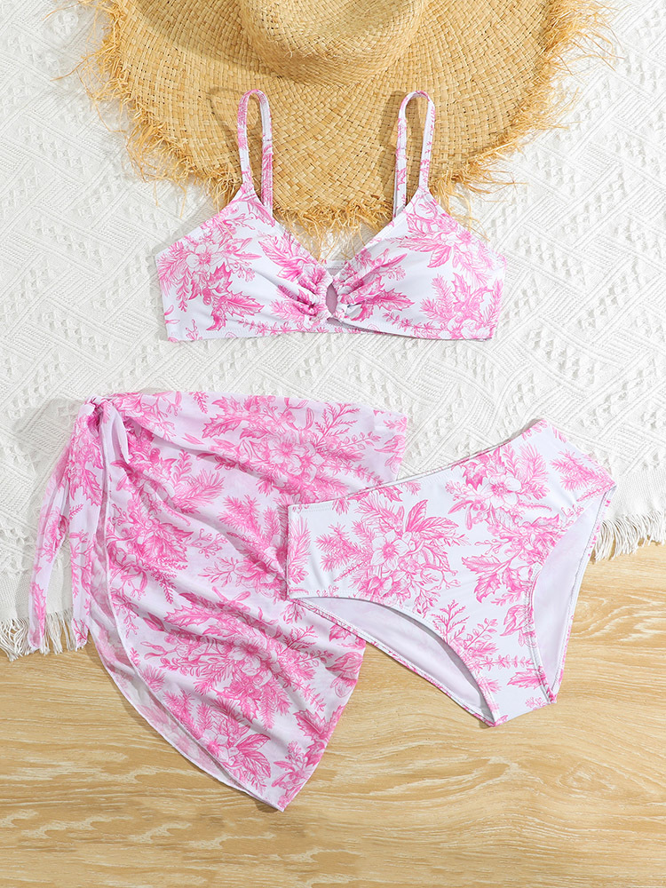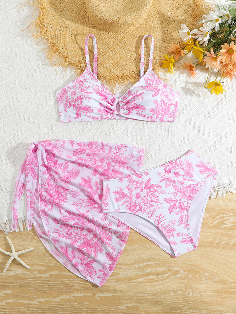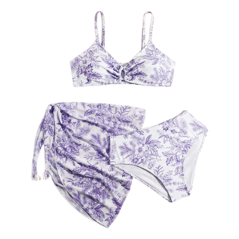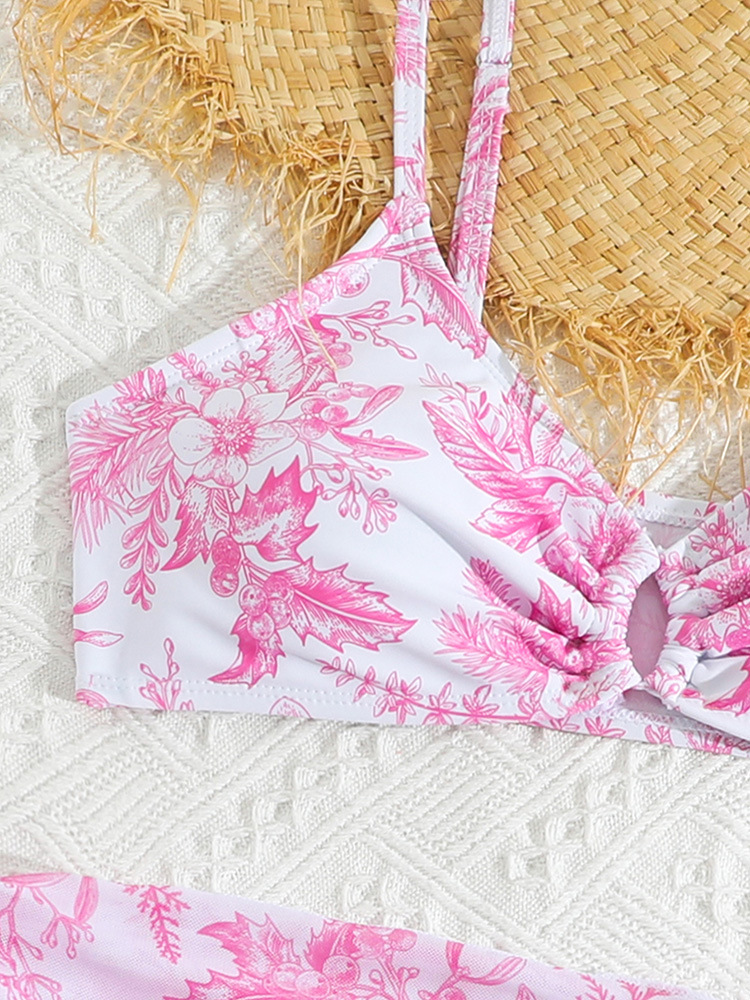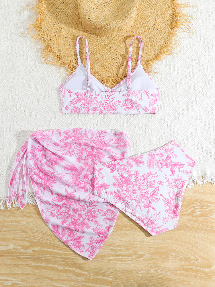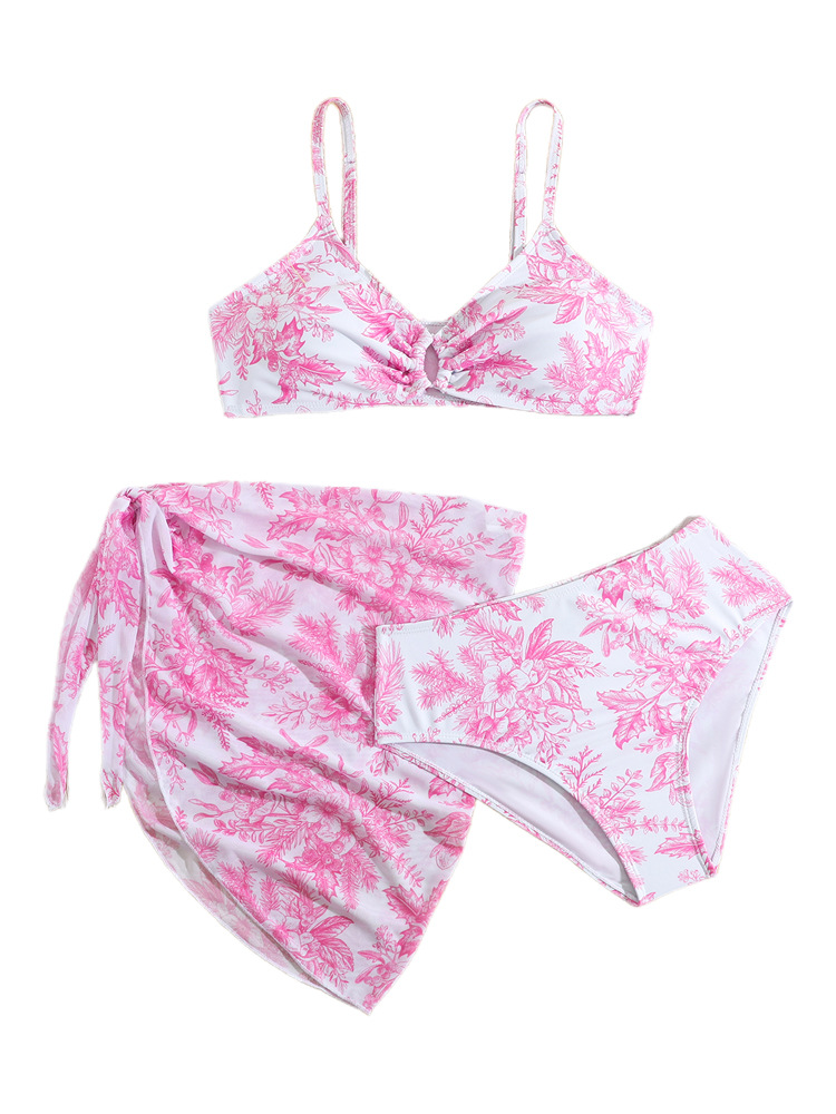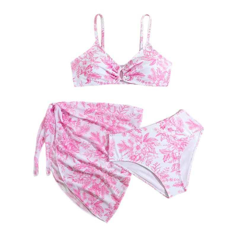 2024 새로운 유럽 및 미국 어린이 수영복 여성 분할 대형 어린이 인쇄 아마존 메쉬 수영복 3 피스 세트