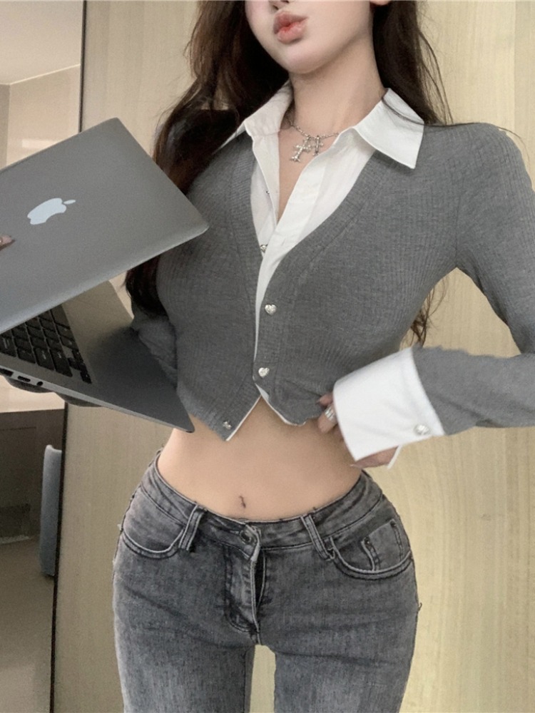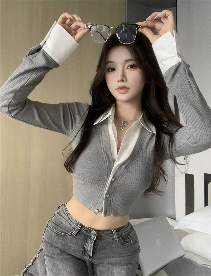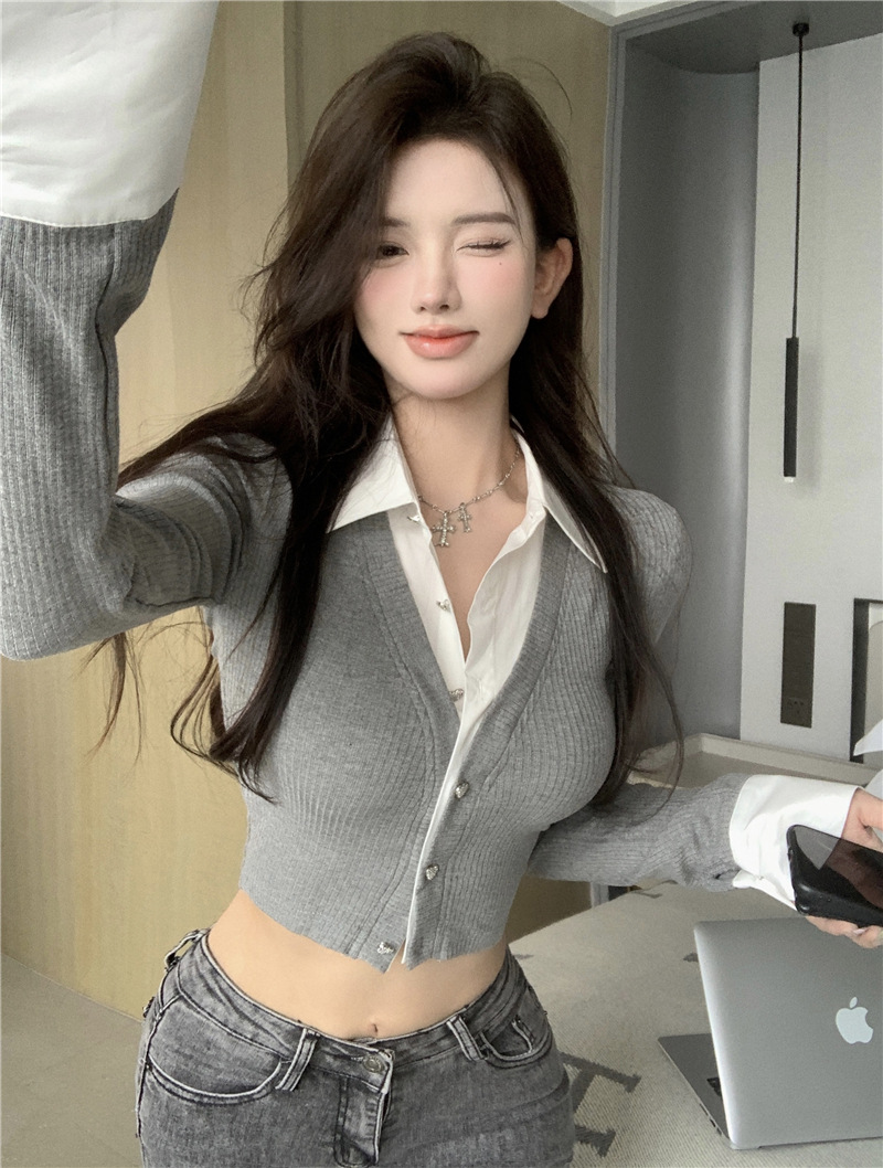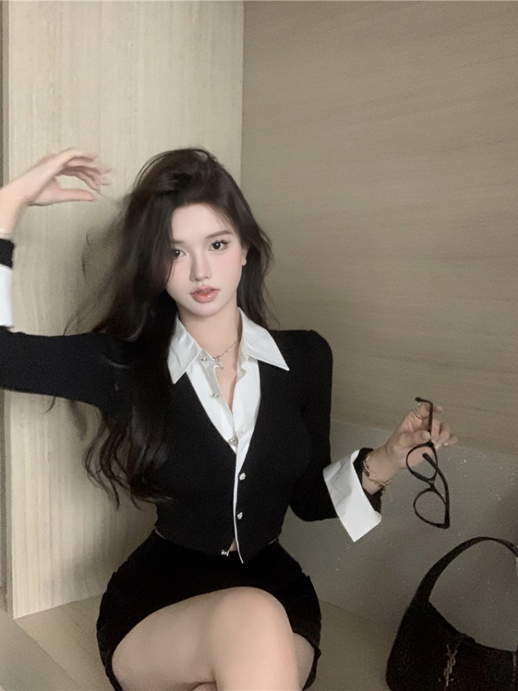 스타 스레드 가짜 투피스 셔츠 여성 디자인 센스 틈새 이른 가을 순수한 달콤한 스타일 스파이스 소녀 섹시한 짧은베이스