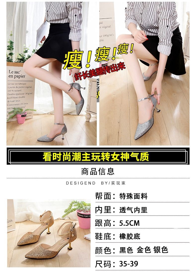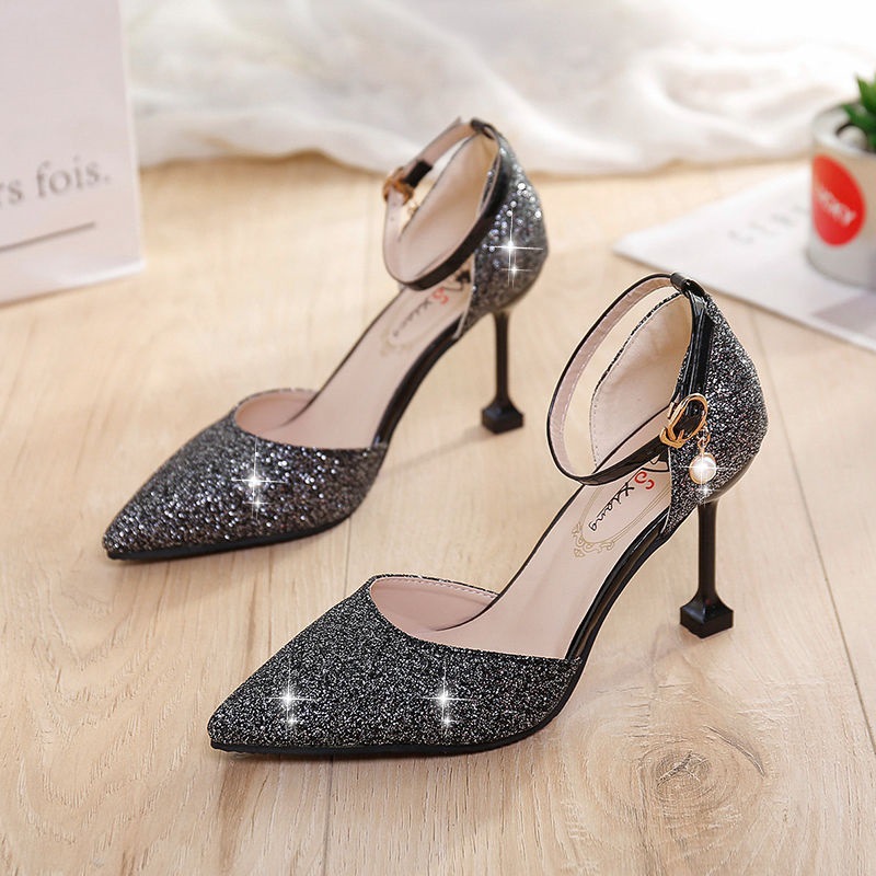 사이버 축하 Sequin High Heels 여성용 2022 년 여름 새로운 포인팅 한 줄 버클 샌들 여성용 스틸레토 힐 페어리 스타일 싱글 레이어 신발스토어 가기