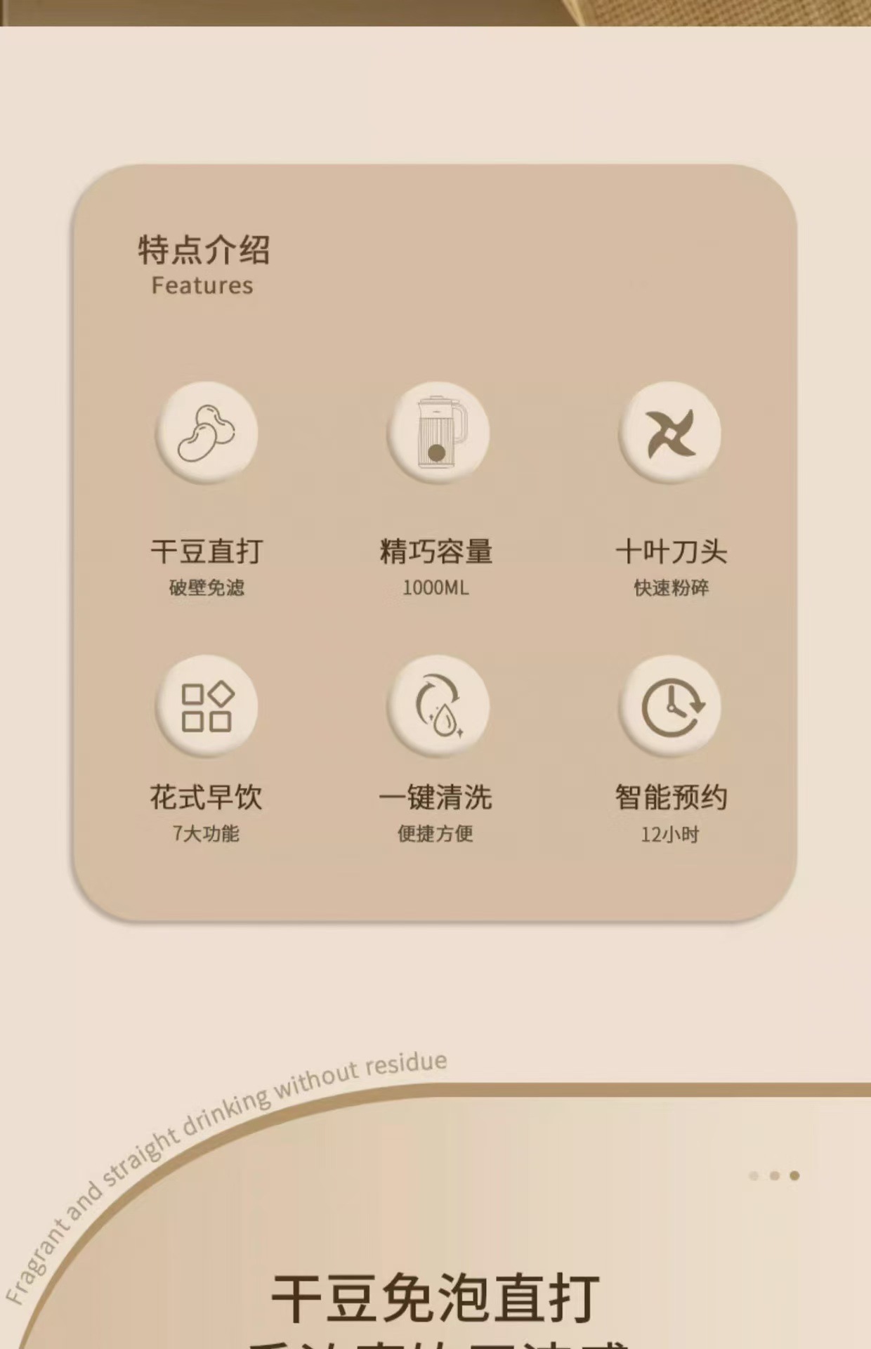 卖点:六大功能选择,12小时预约,一键清洗,免泡豆,低噪音,开盖保护,防糊底,4小时保温,彩屏