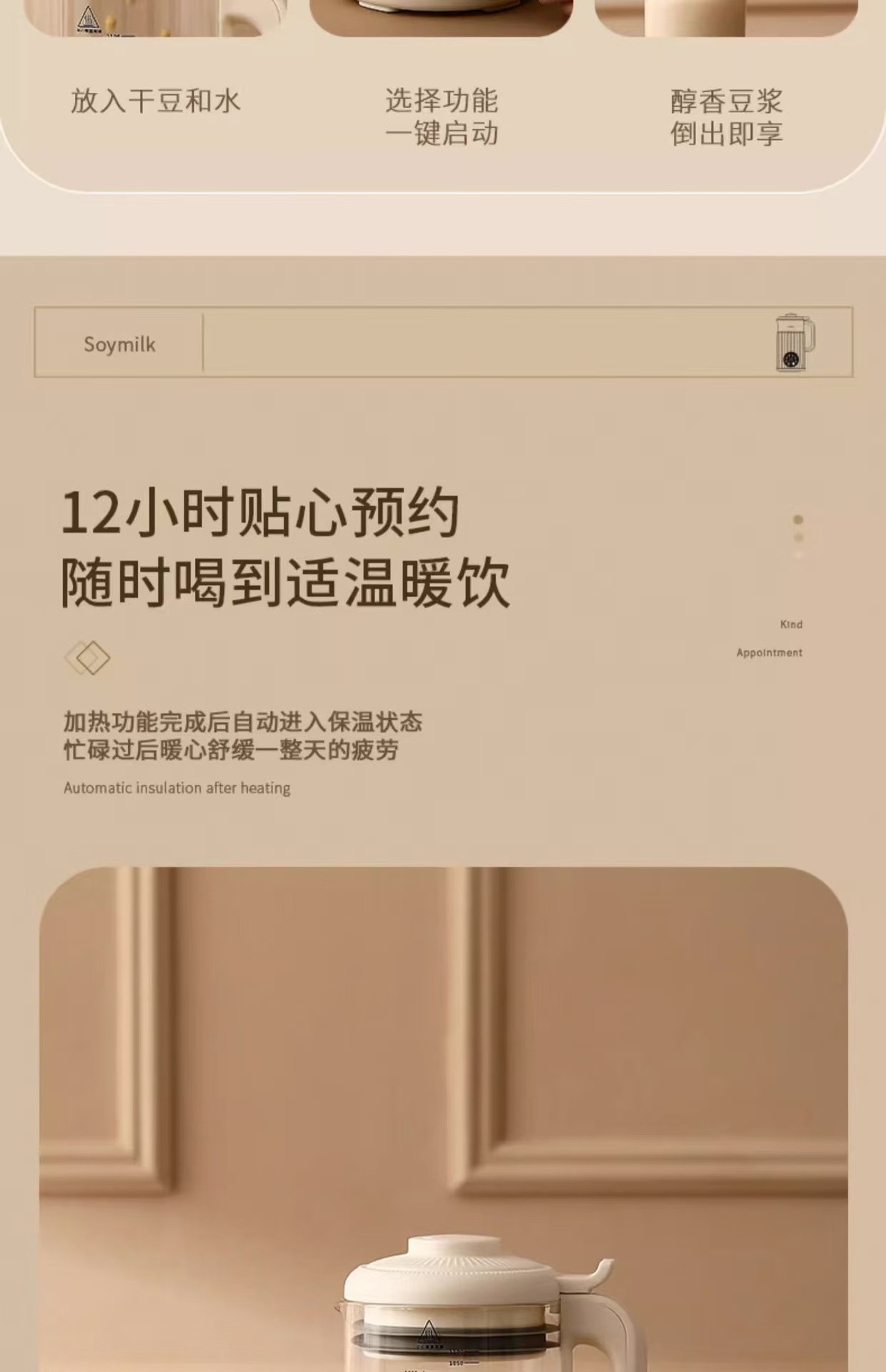 功能:豆浆、烧水、果汁、米糊、清洗、保温、预约,高原检测