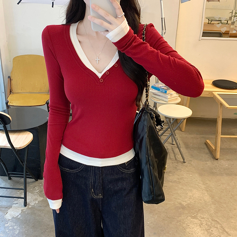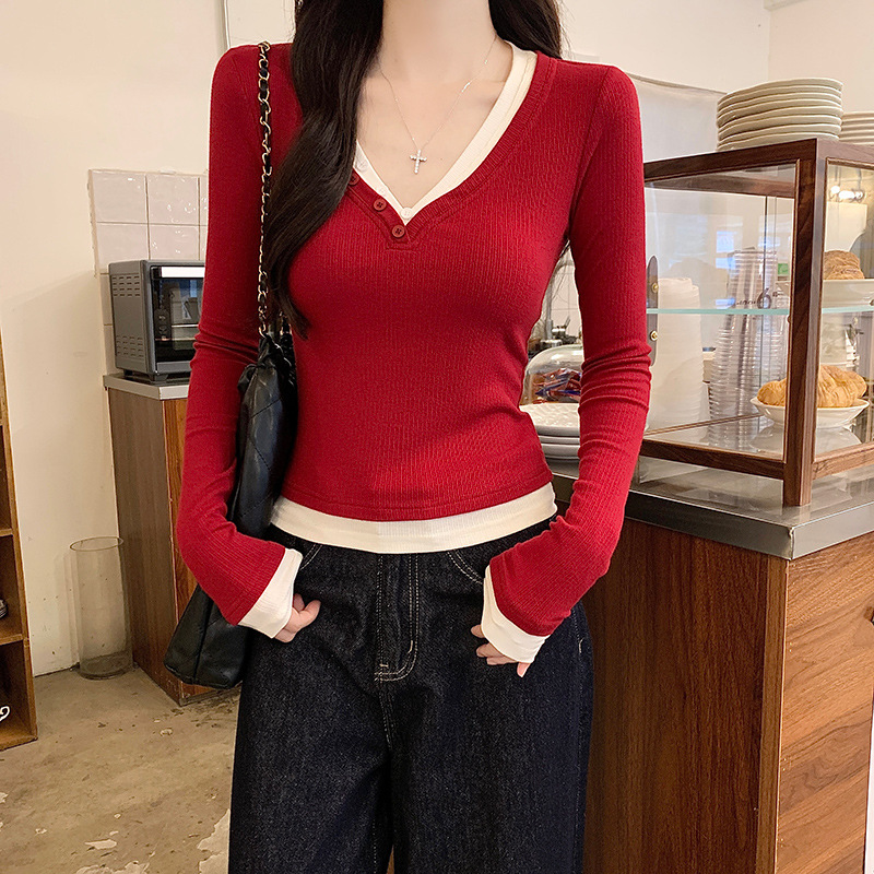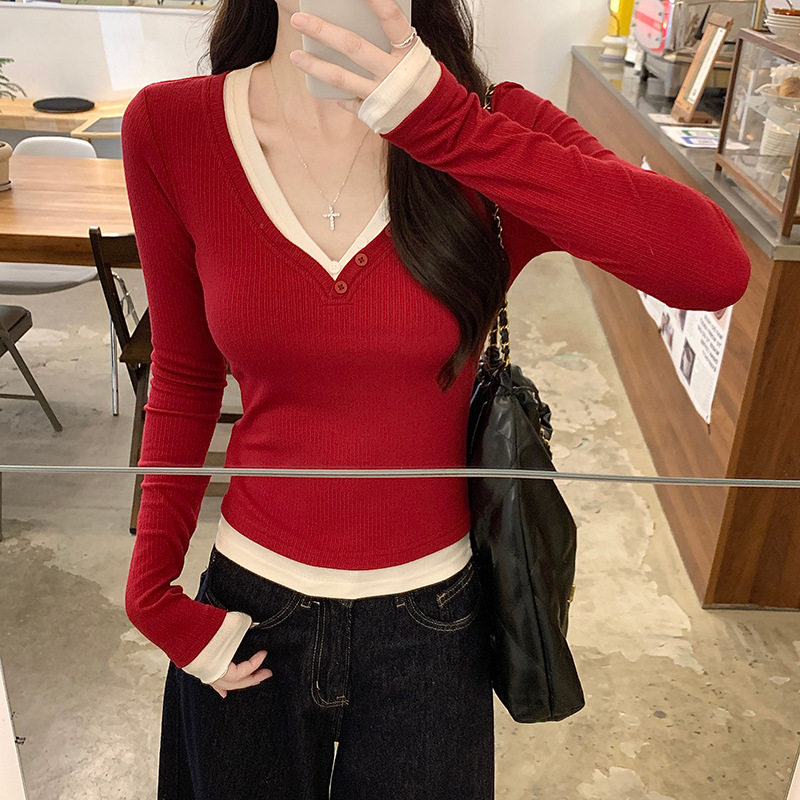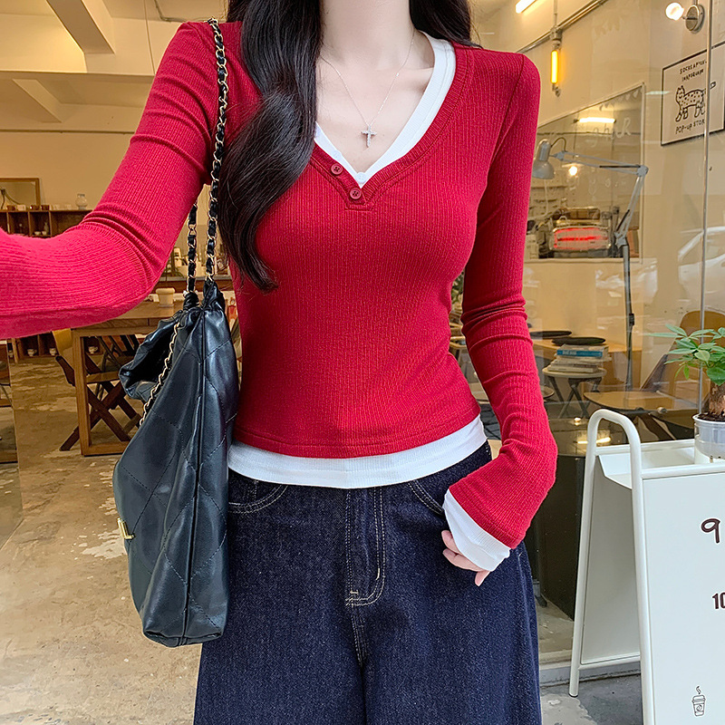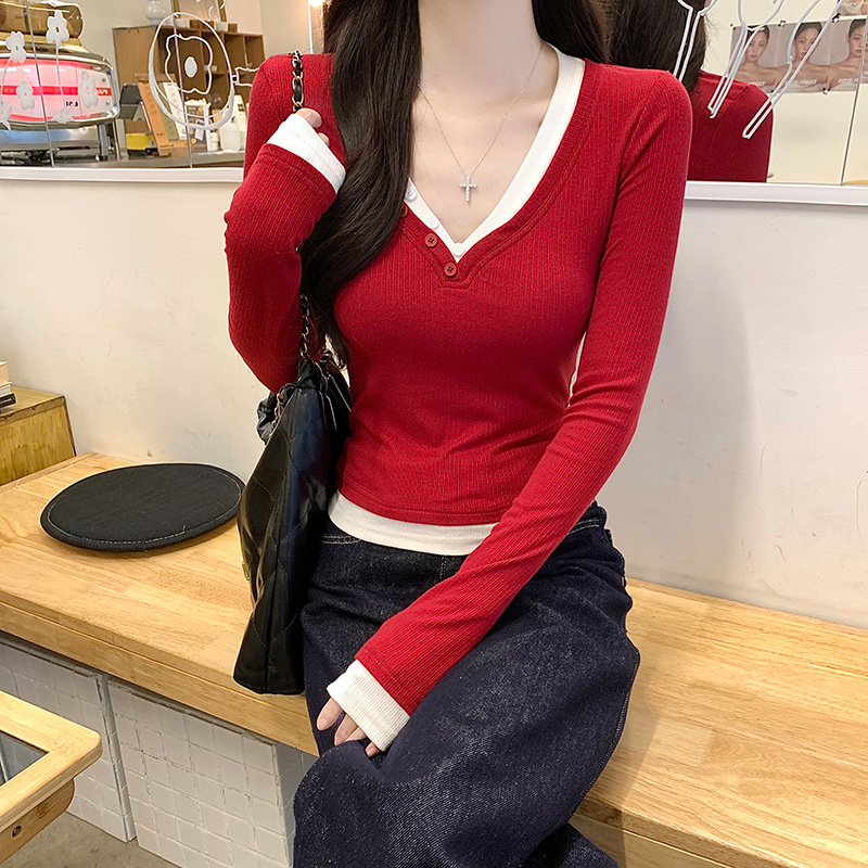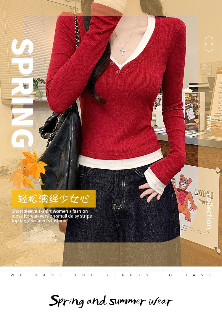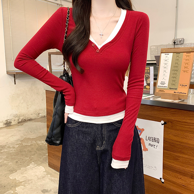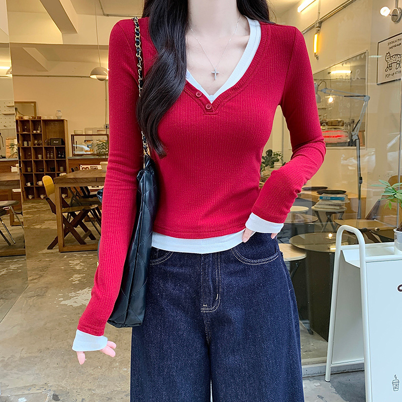 달콤한 스파이스 소녀 빨간 가짜 투피스 스티칭 V 넥 긴팔 티셔츠 여성용 가을과 겨울 디자인 센스 슬림 핏 짧은 이너 탑