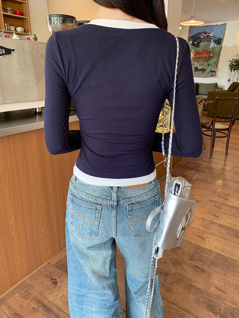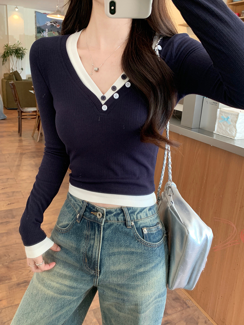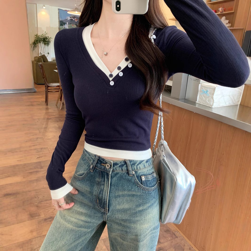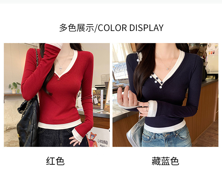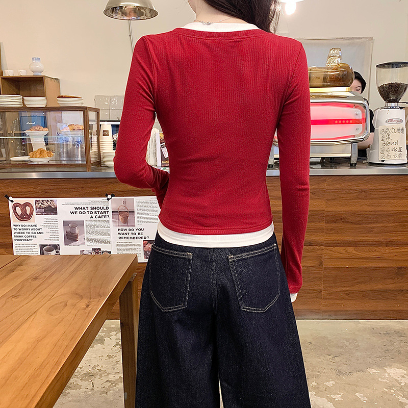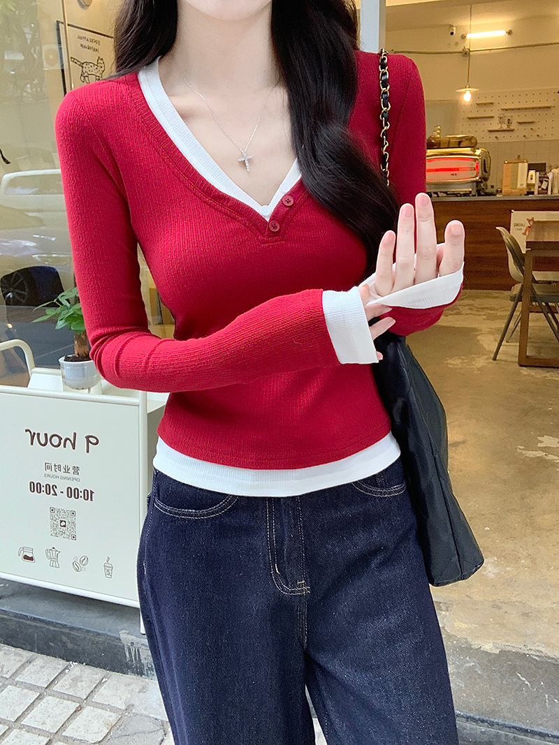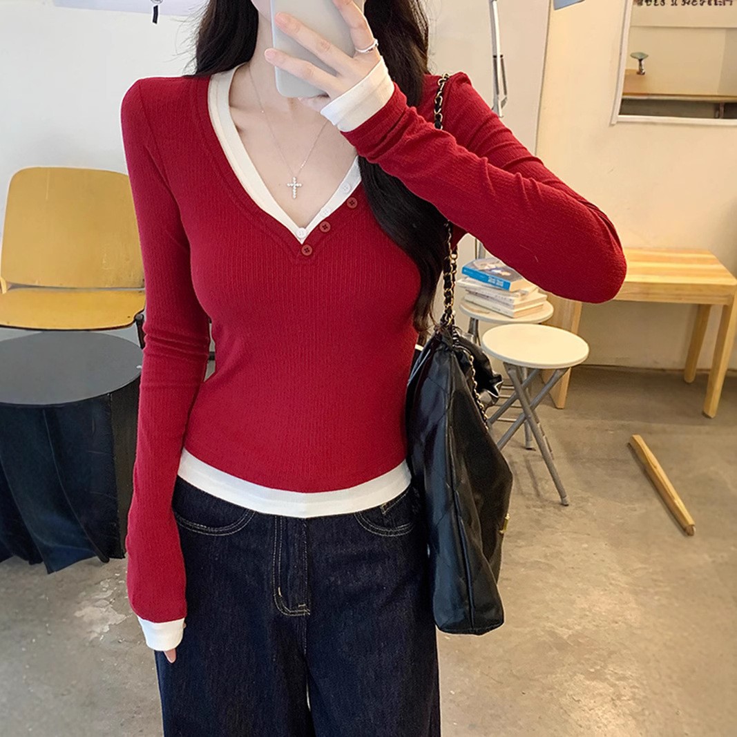 달콤한 스파이스 소녀 빨간 가짜 투피스 스티칭 V 넥 긴팔 티셔츠 여성용 가을과 겨울 디자인 센스 슬림 핏 짧은 이너 탑