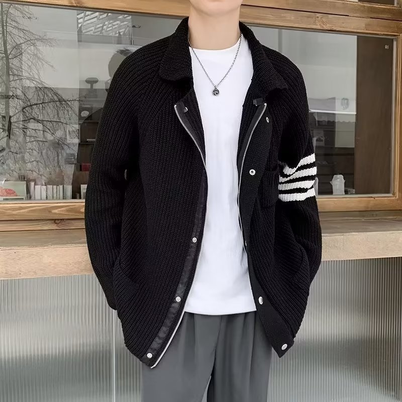 유럽과 미국의 고급 니트 재킷 남성 가을과 겨울 패션 스트라이프 캐주얼 스티칭 잘 생긴 옷깃 스웨터 코트 남성
