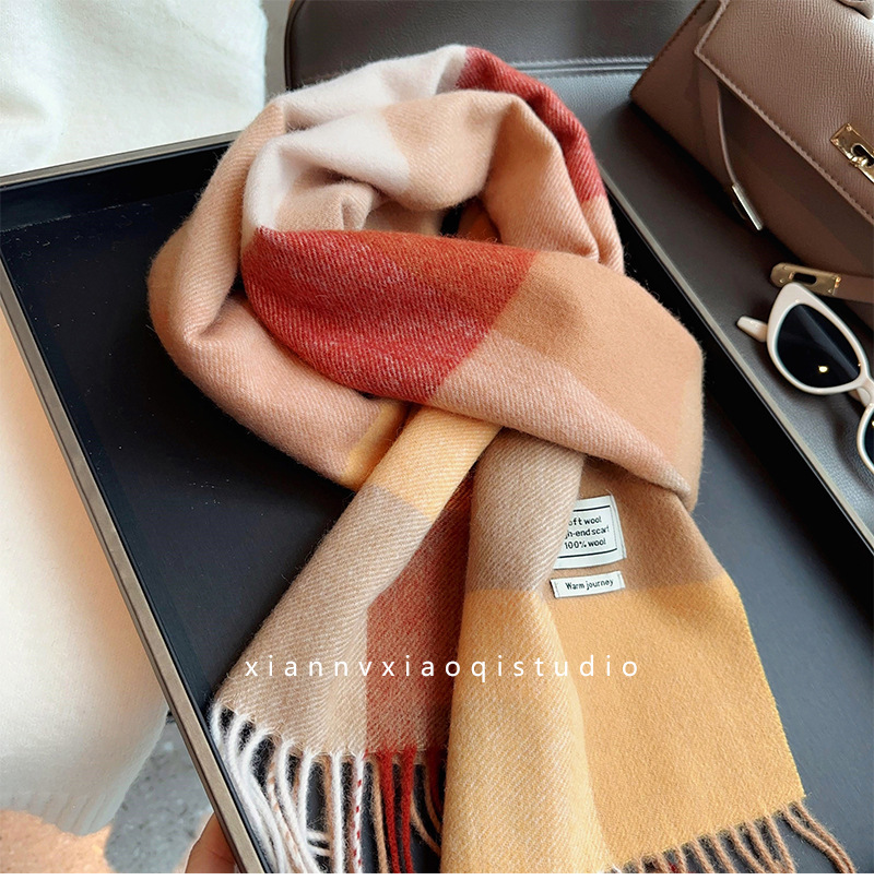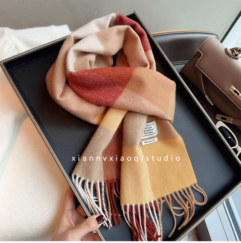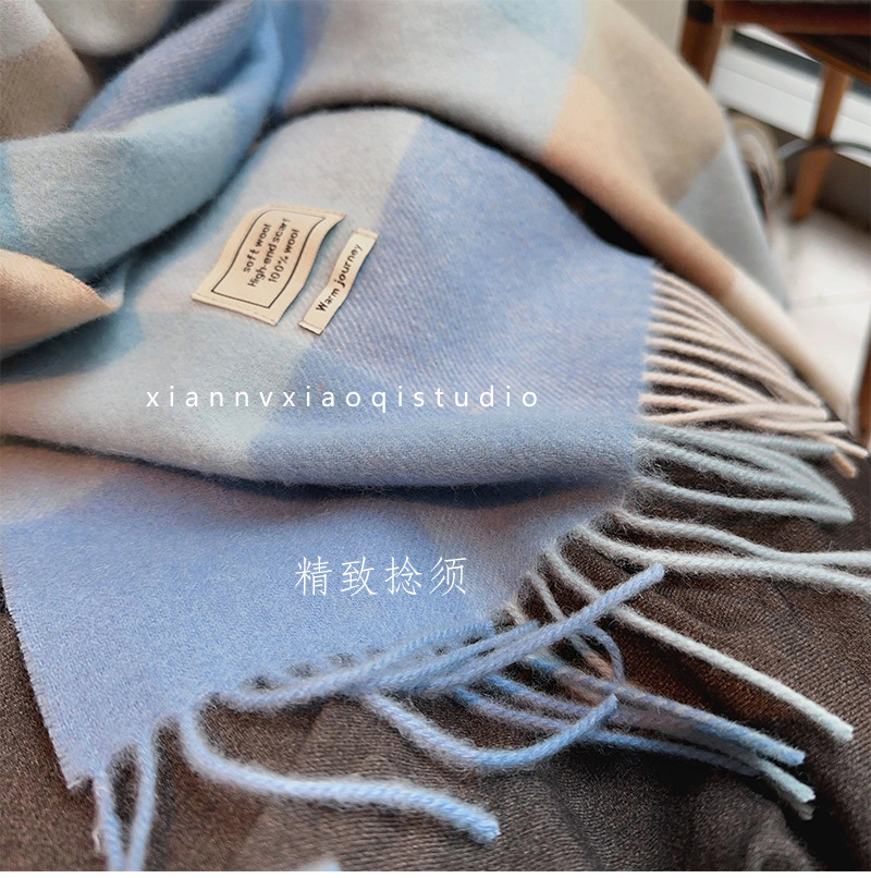 经典时尚方格蓝色100%羊毛围巾女新款秋冬季长款流苏披肩两用围脖