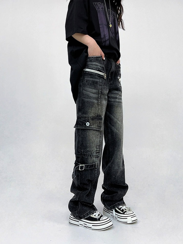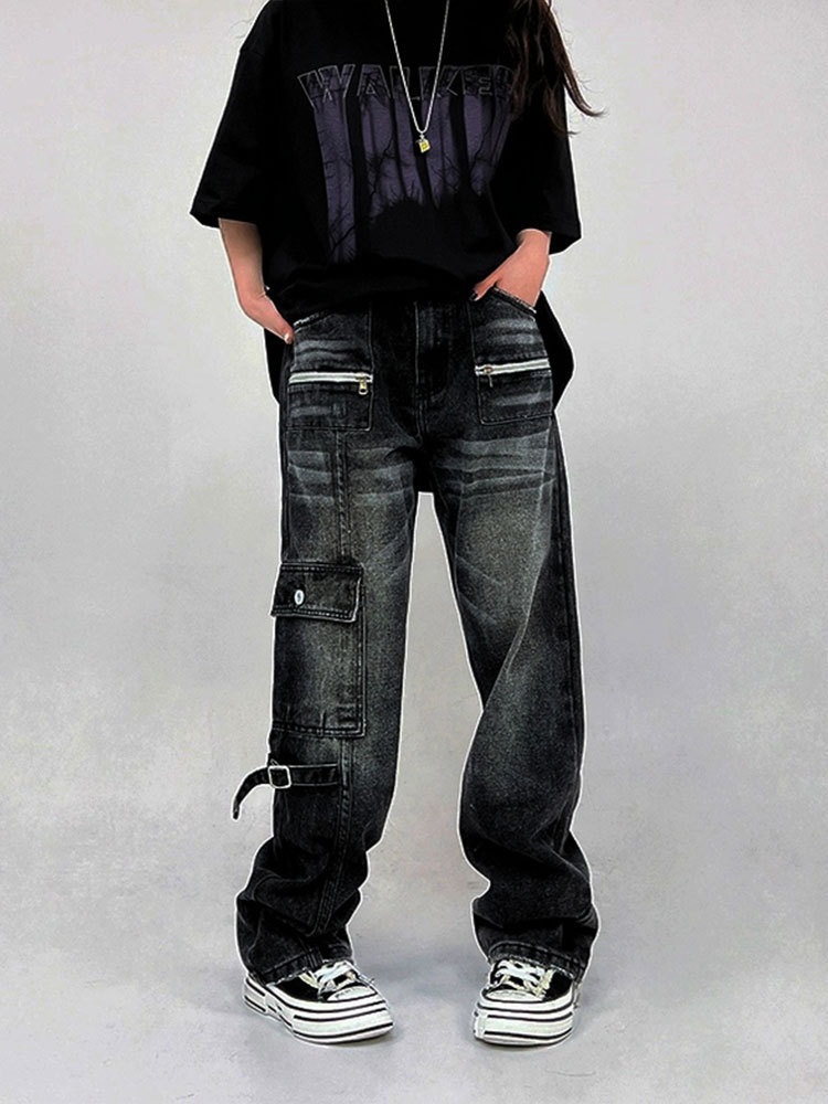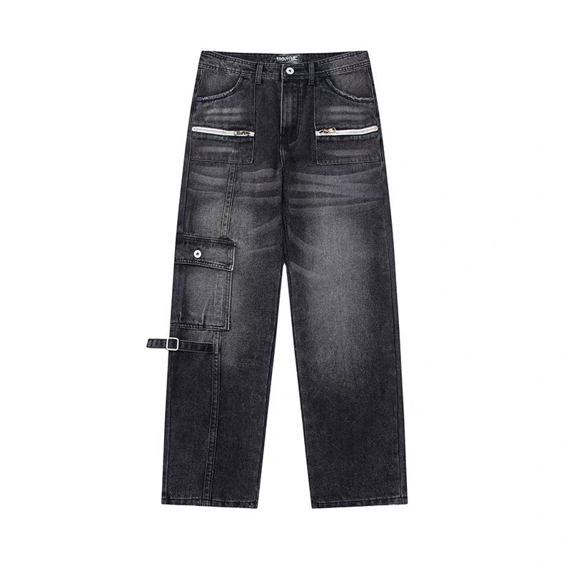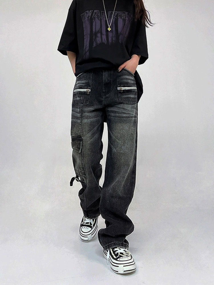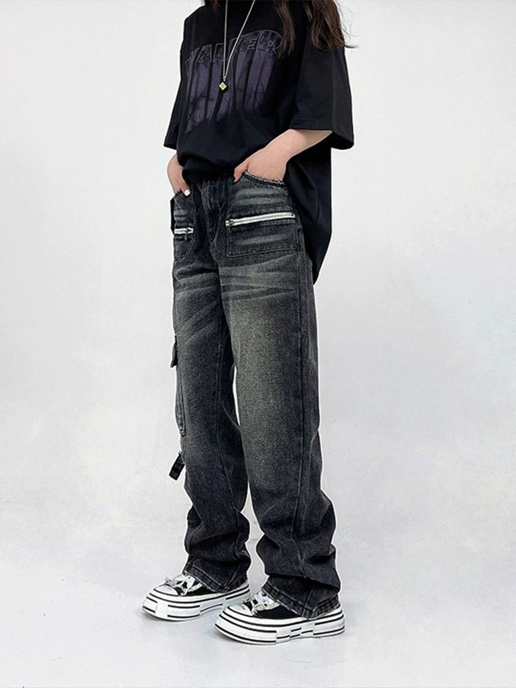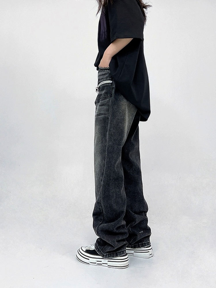2024 새로운 레트로 블랙 그레이 청바지 남성 가을 딥 와이드 레그 팬츠 스트레이트 루즈 캐주얼 롱 팬츠스토어 가기