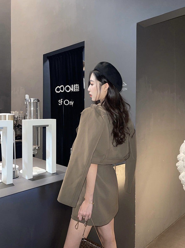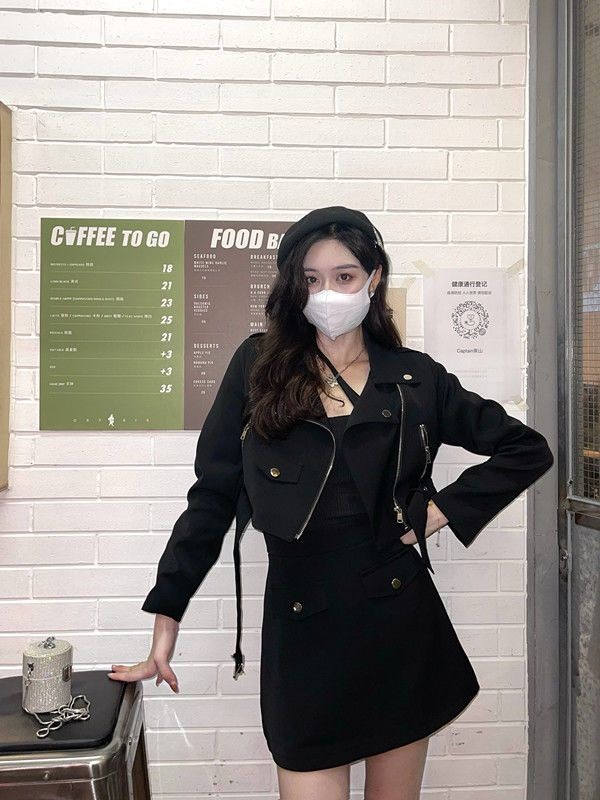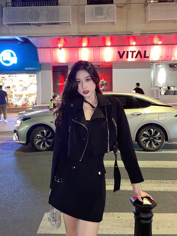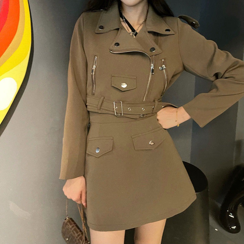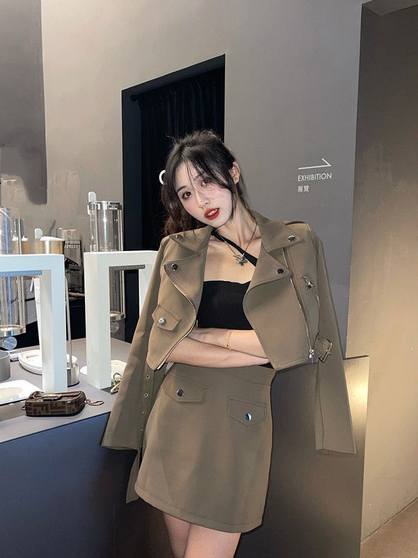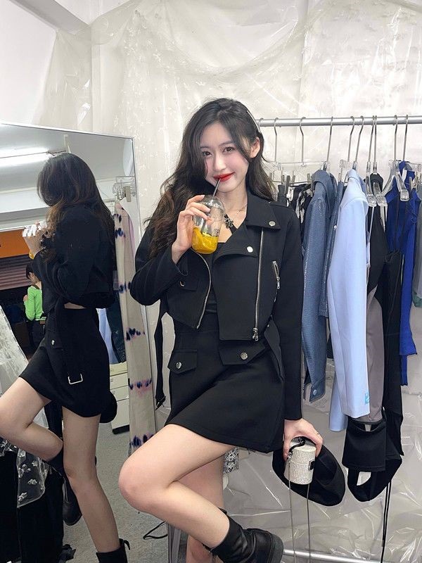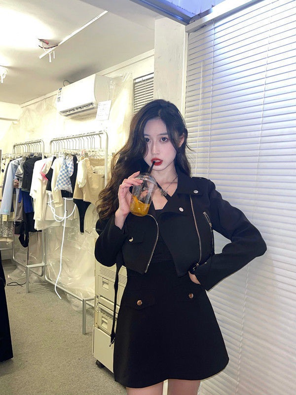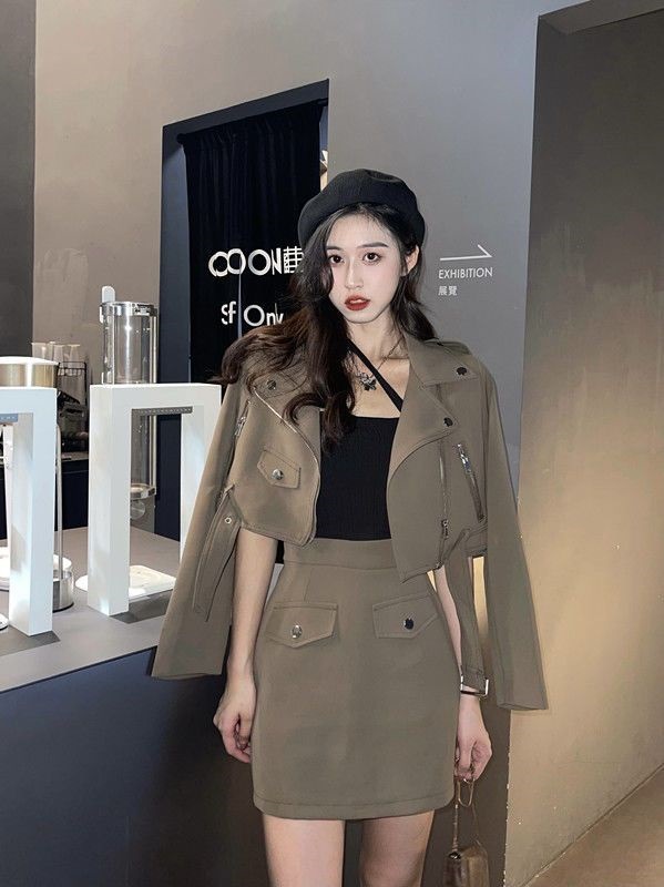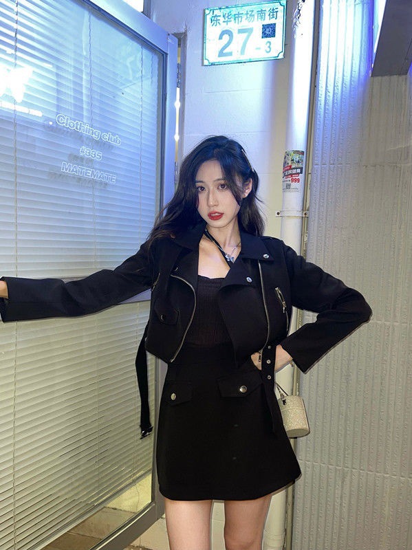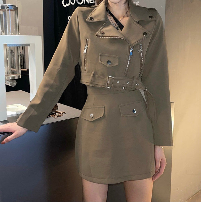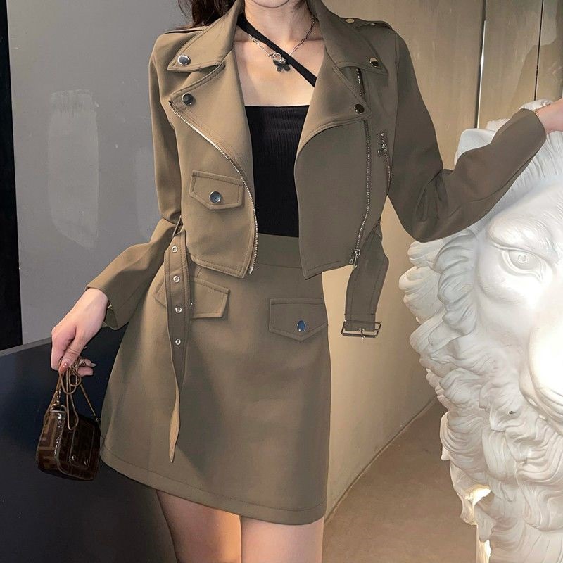 싱글/플러스 사이즈 여성의 봄과 가을 통통녀 긴 소매 오토바이 짧은 코트 튀긴 거리 디자인 스커트 2 피스 200kg스토어 가기