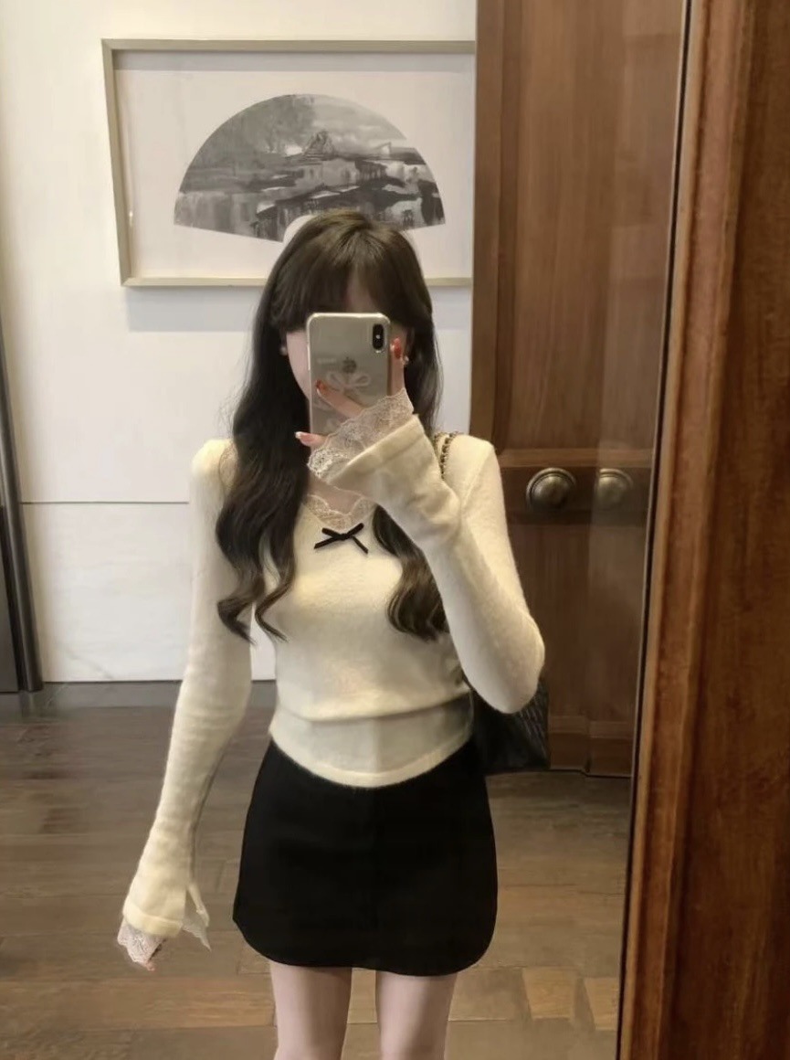 프렌치 스타일 레이스 트림 벨 슬리브 브이넥 여성용 가을 겨울 디자인 니트 상의