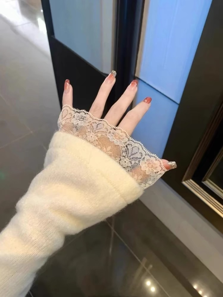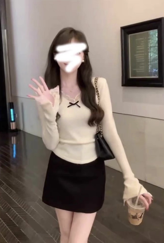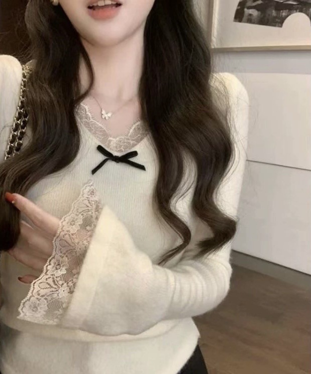 프렌치 스타일 레이스 트림 벨 슬리브 브이넥 여성용 가을 겨울 디자인 니트 상의스토어 가기