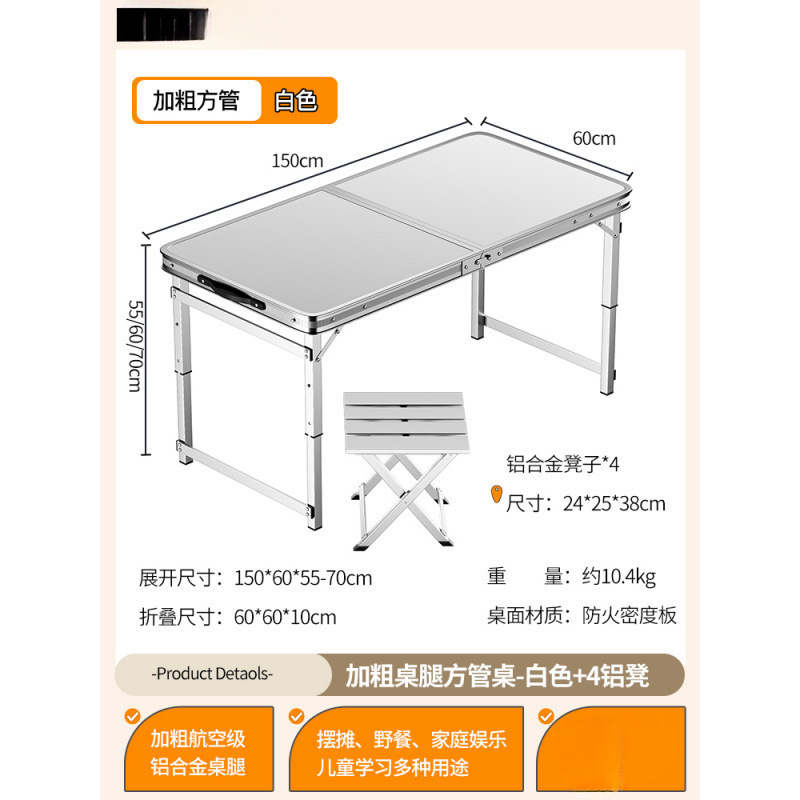 • [업그레이드된 알루미늄 합금 사각 튜브] 150*60cm 흰색 + 알루미늄 스툴 4개