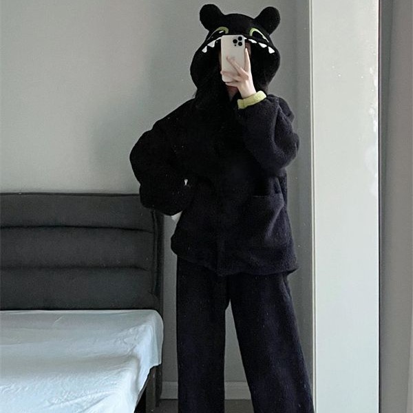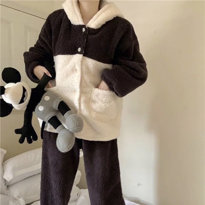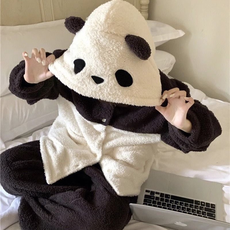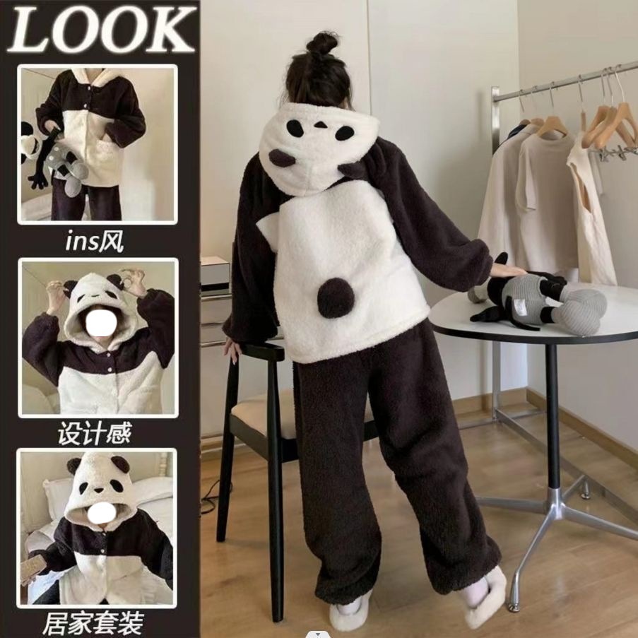 소녀의 귀여운 팬더 후드 산호 양털 파자마 여성의 겨울 새 기모 두꺼운 따뜻한 집 옷 세트스토어 가기