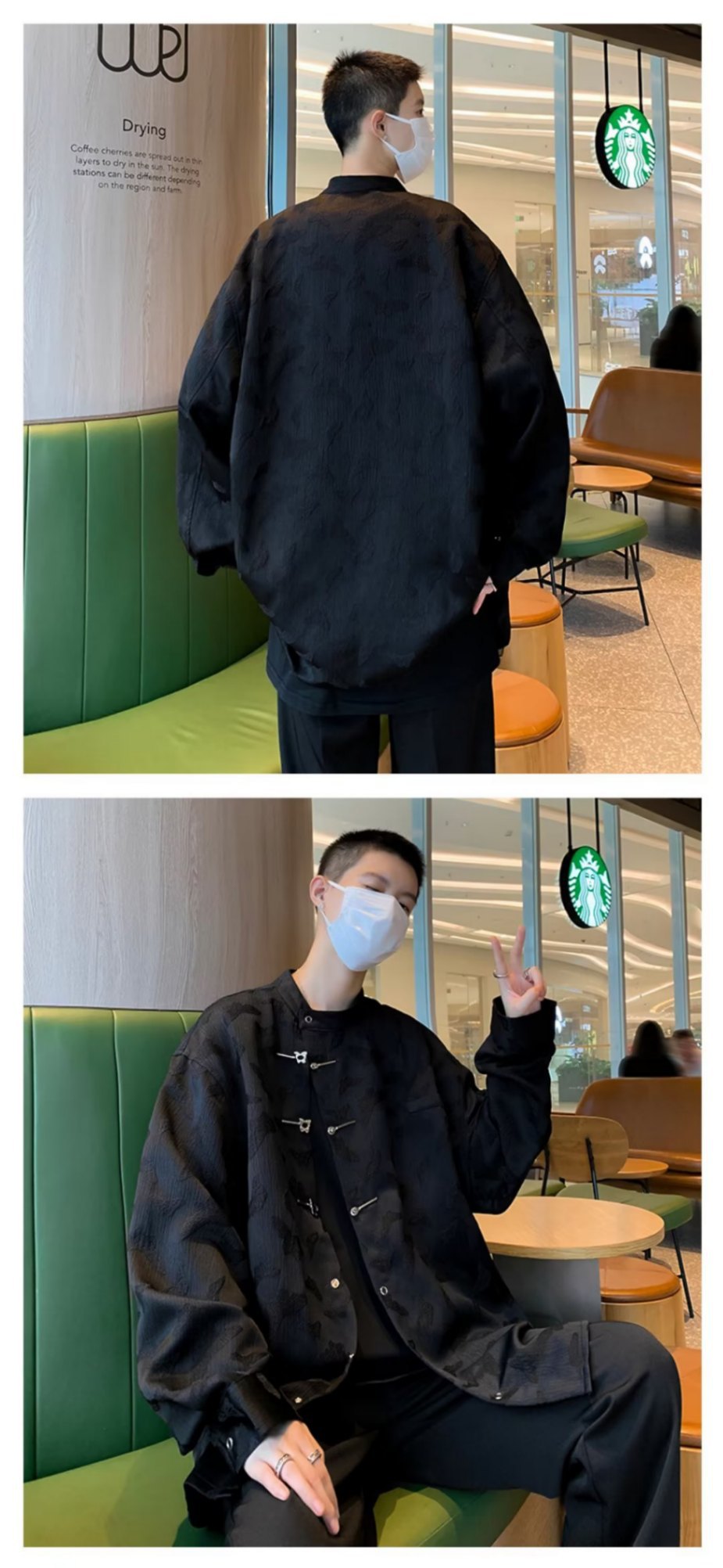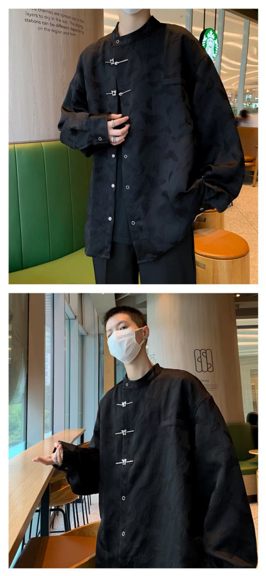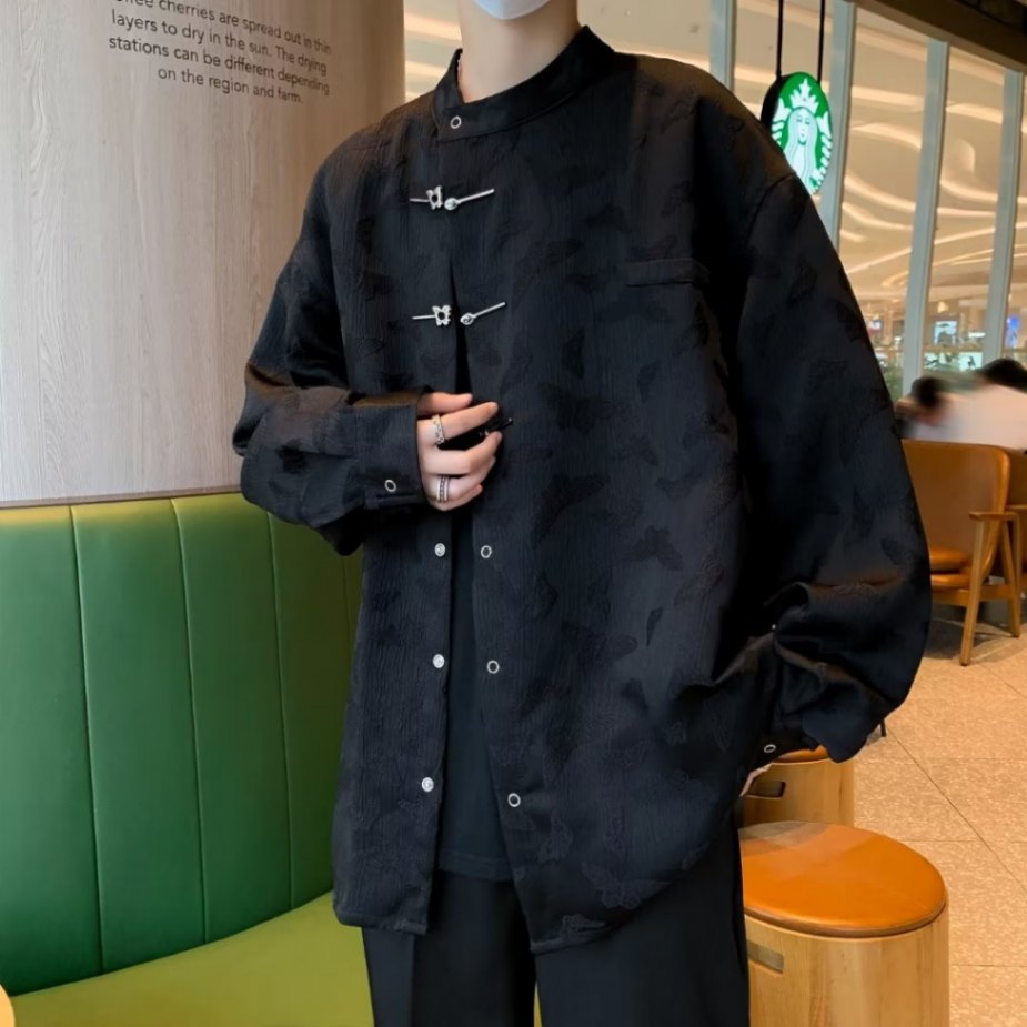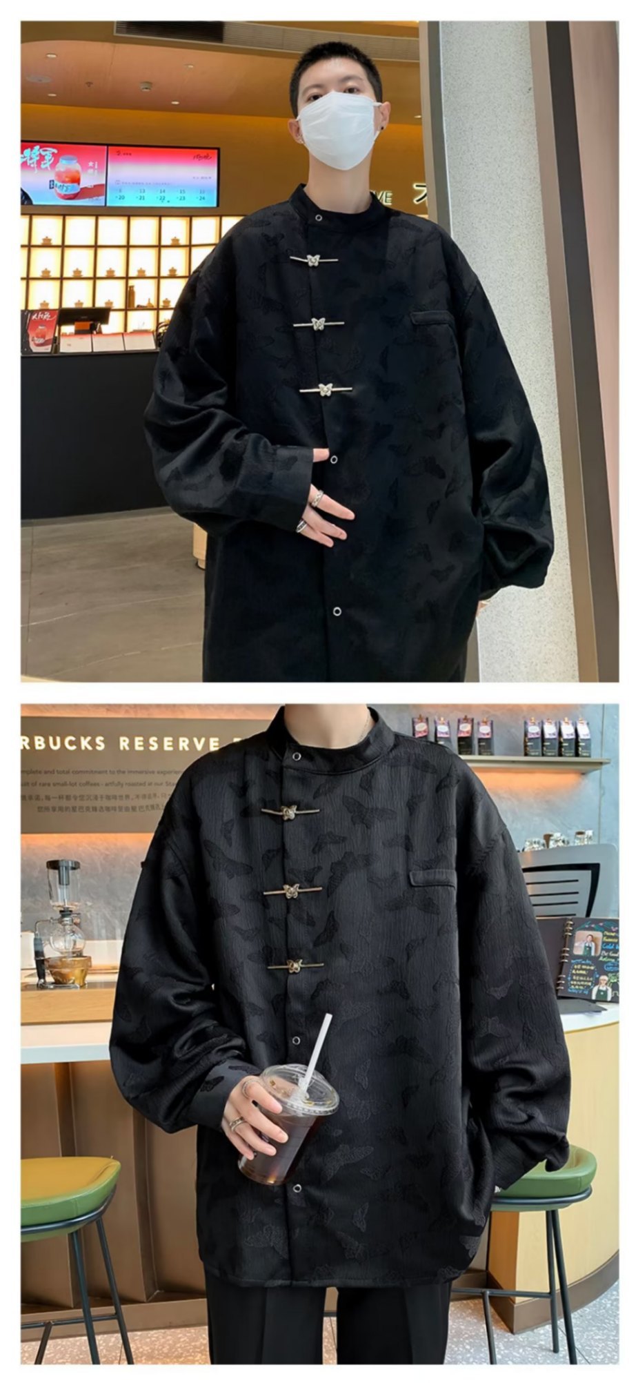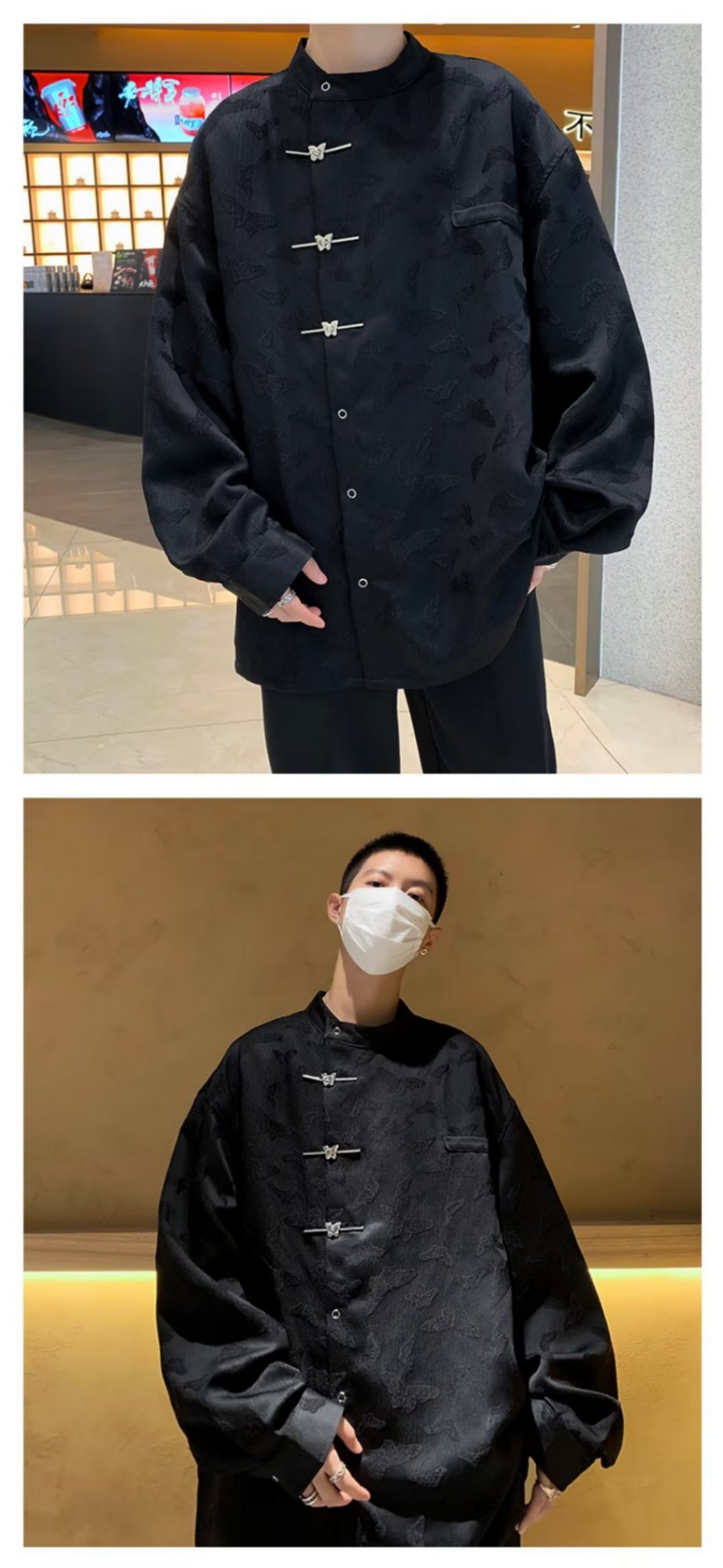 국가 유행 새로운 중국 스타일 나비 버클 다크 패턴 긴 소매 셔츠 남자 일본 스타일 레트로 세트 틈새 탕 세트 코트 셔츠 의류스토어 가기