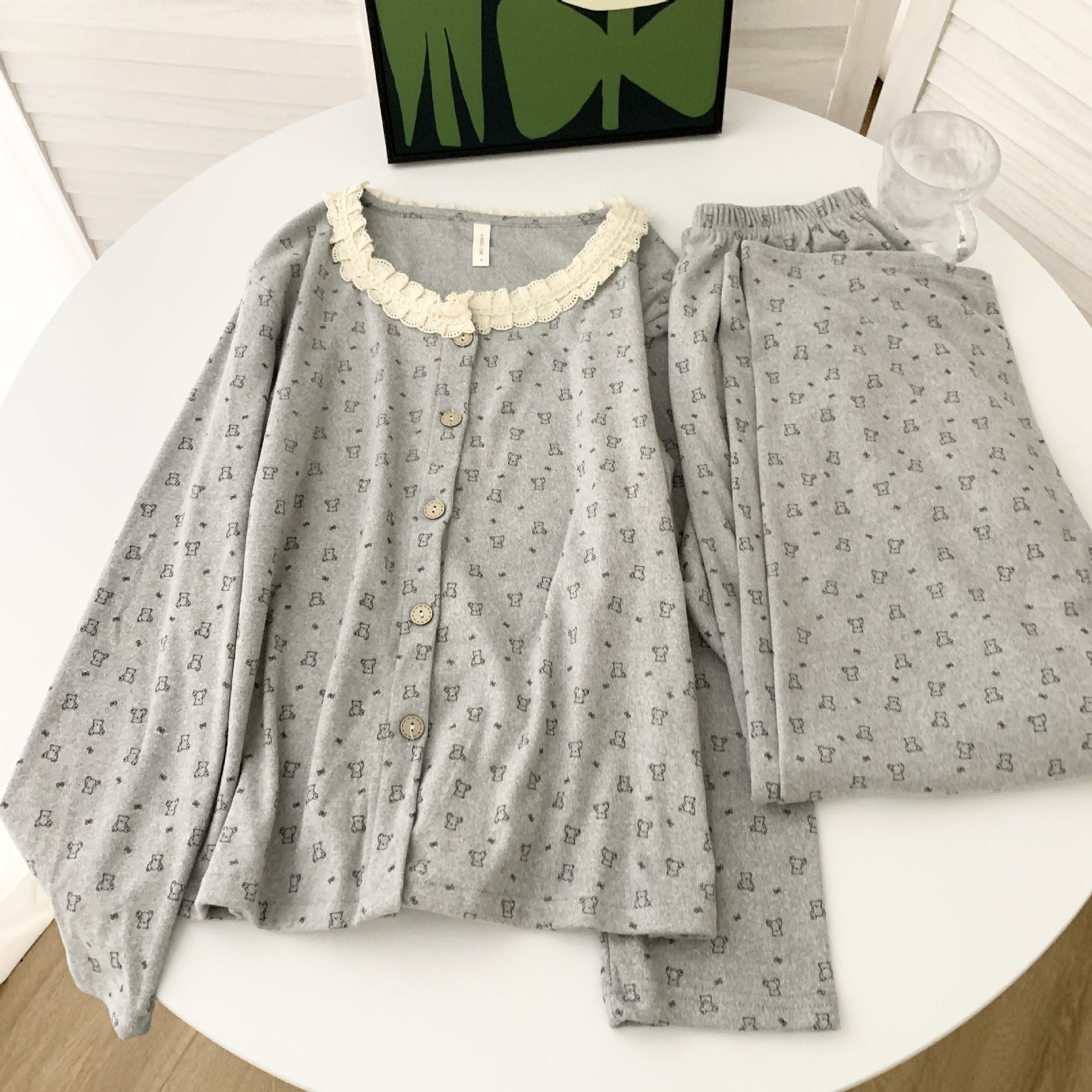 한국 홈웨어 세트, 독일산 벨벳 스타일 잠옷, 여성용, 외출 가능, 달콤한 신상 봄 가을 곰돌이 스타일