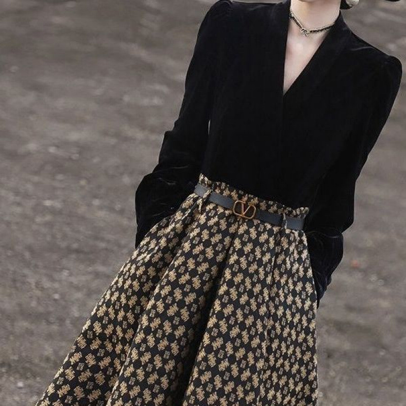 패션 레트로 우아한 벨벳 가짜 2 피스 스티칭 슬림 핏 자카드 원피스 여성의 가을과 겨울 새로운 도착 스커트스토어 가기