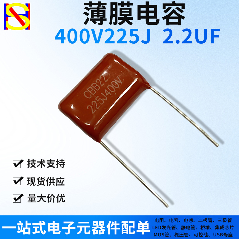 一站式电子元器件BOM配单聚丙烯膜电容器(CBB22) 400V225J 2.2UF薄膜电容切脚短脚剪脚编带