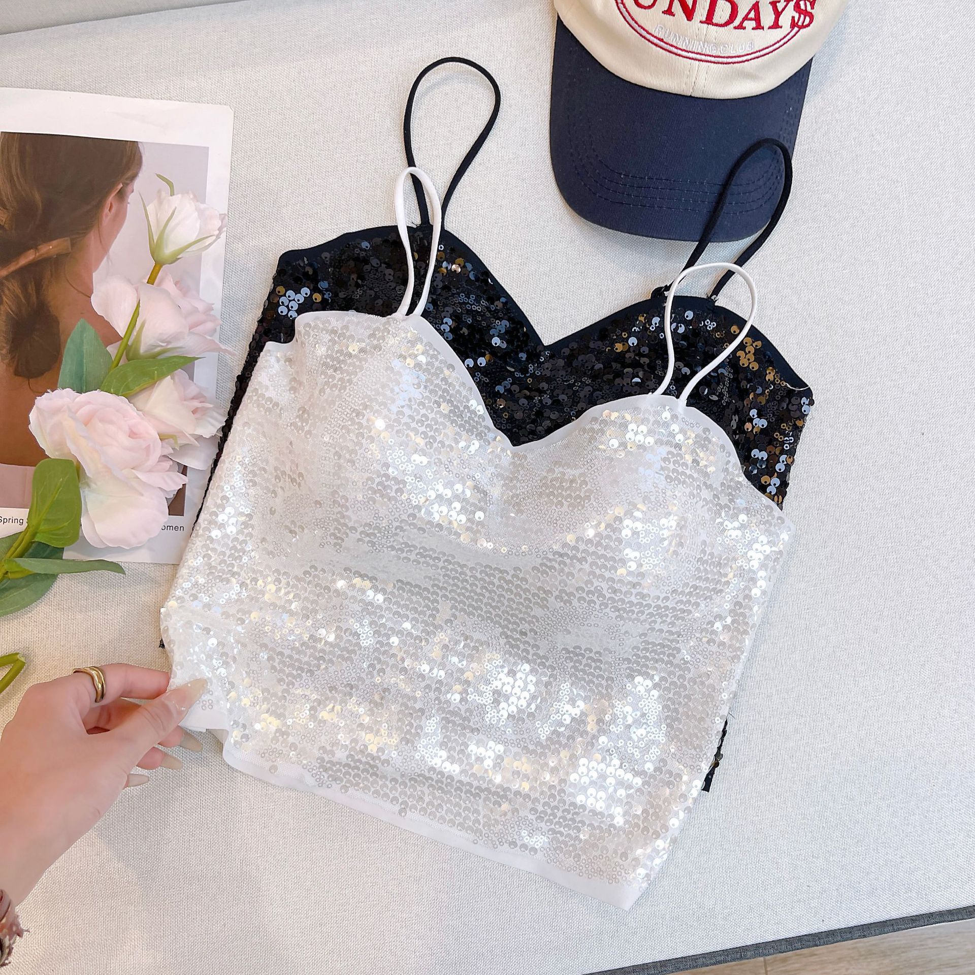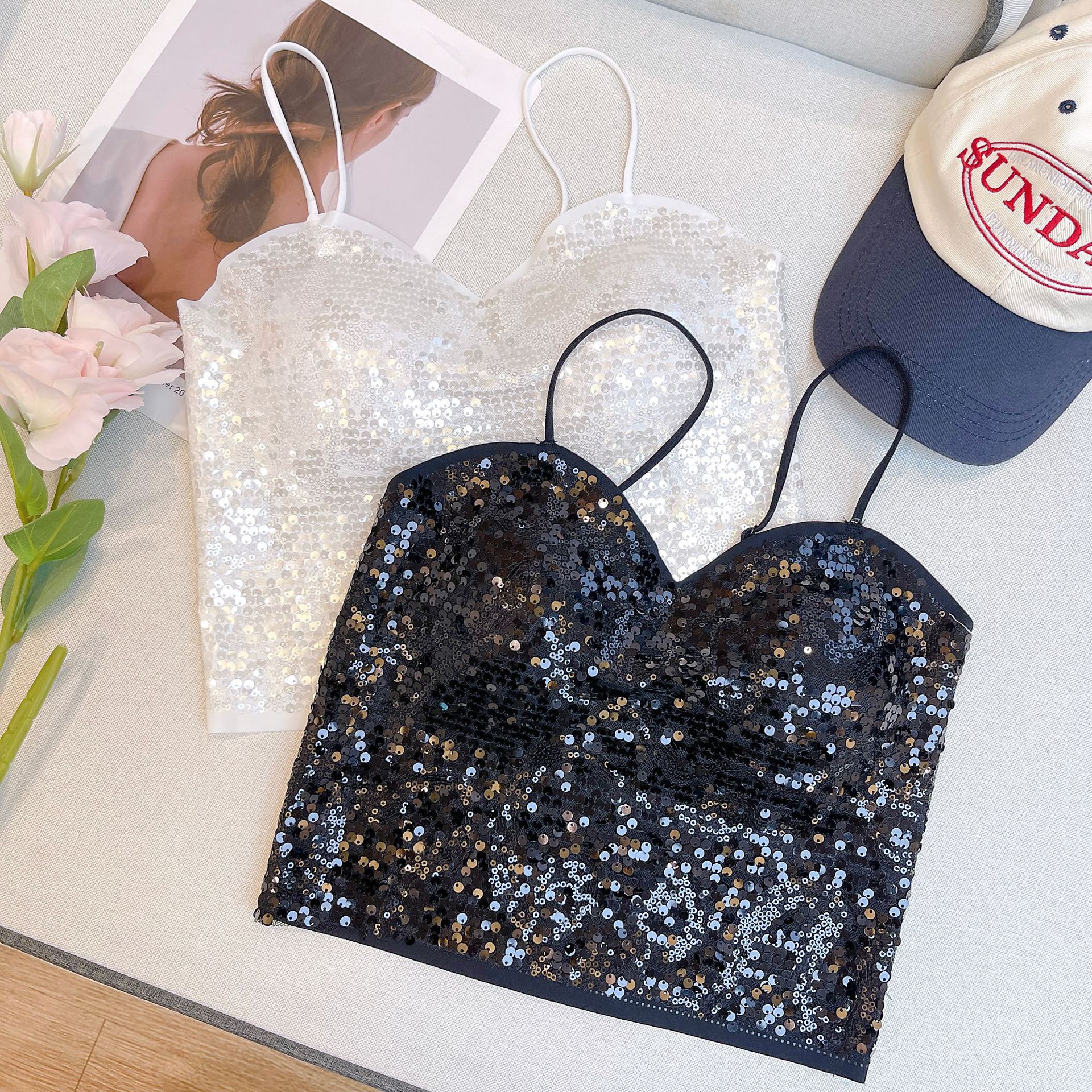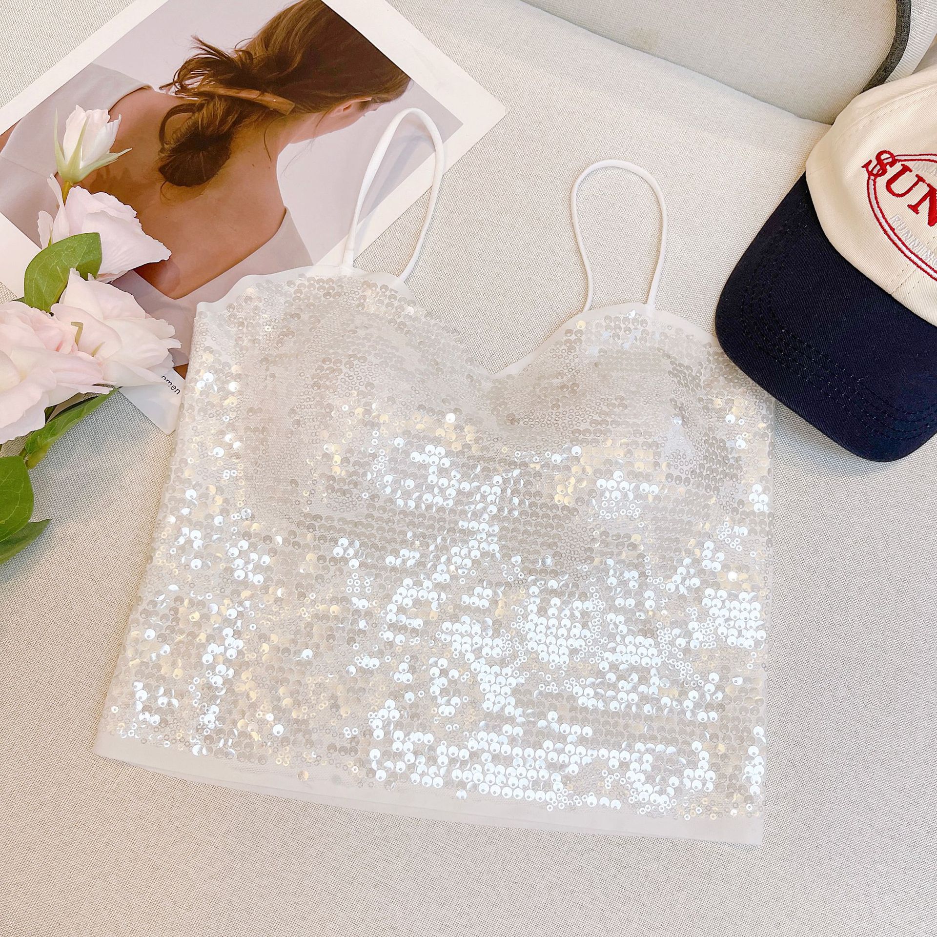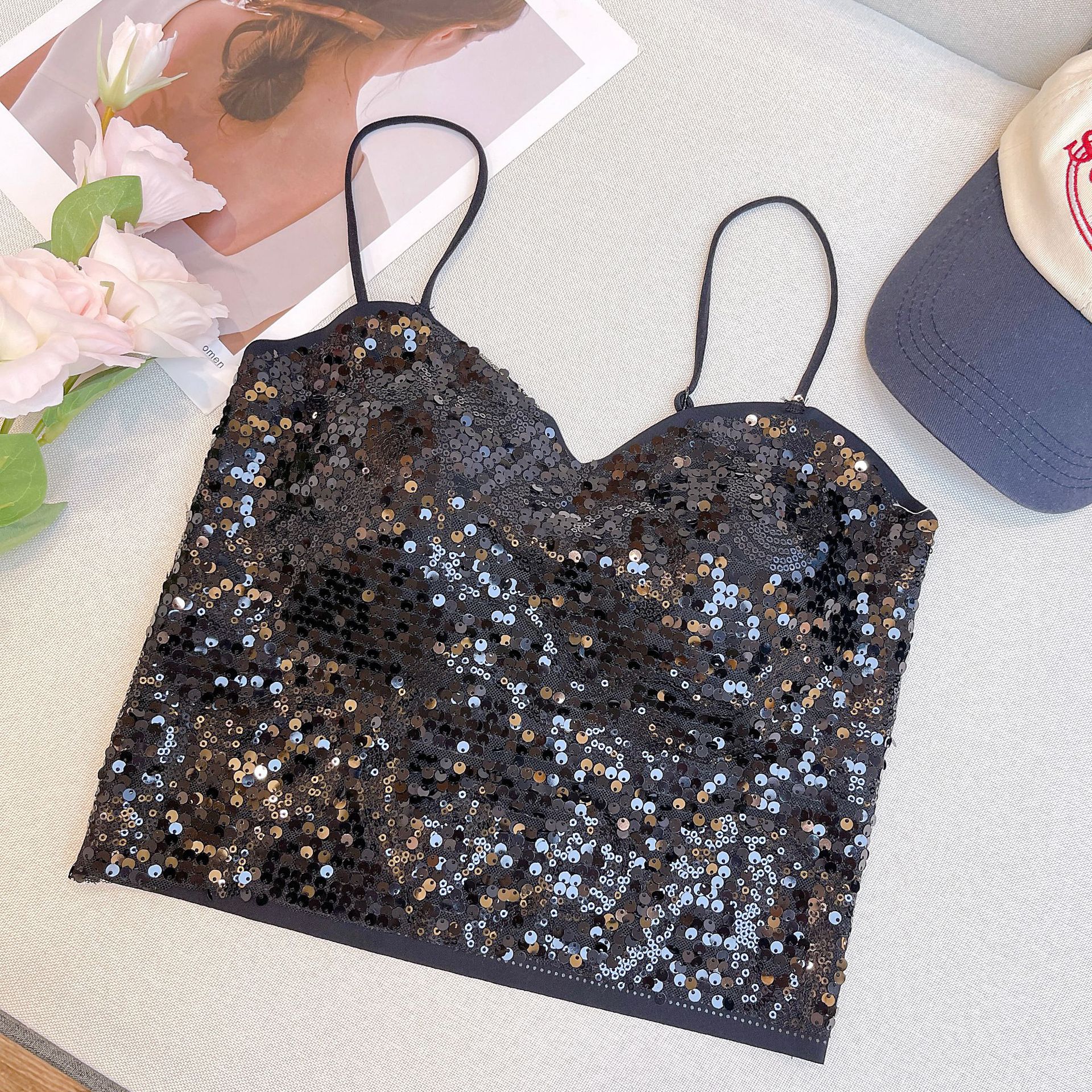 새로운 No Mark Sequin Camisole 여성 내부 조끼, 가슴 패드 섹시한 V-Neck 여성을위한 아름다운 백베이스 재킷스토어 가기