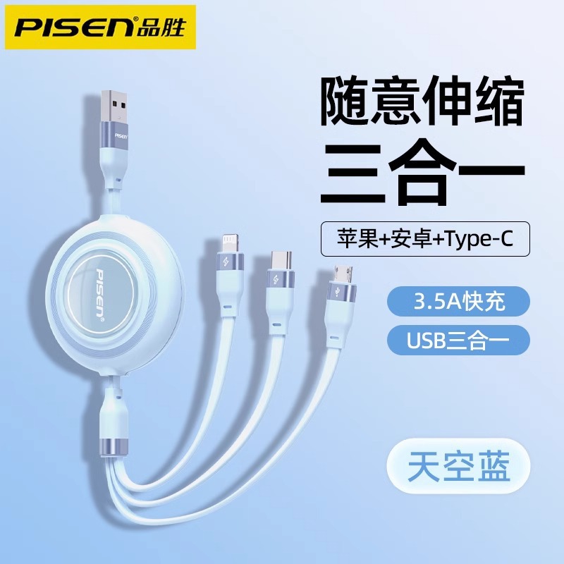 Pinsheng 3 대 1 데이터 라인 3A 고속 충전 라인 개폐식 1 대 3 데이터 라인 인쇄 선물 로고스토어 가기