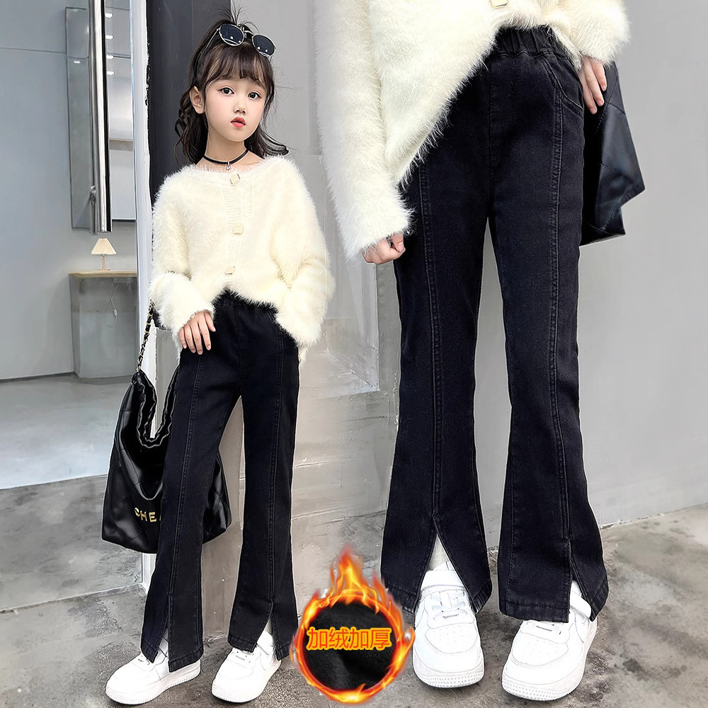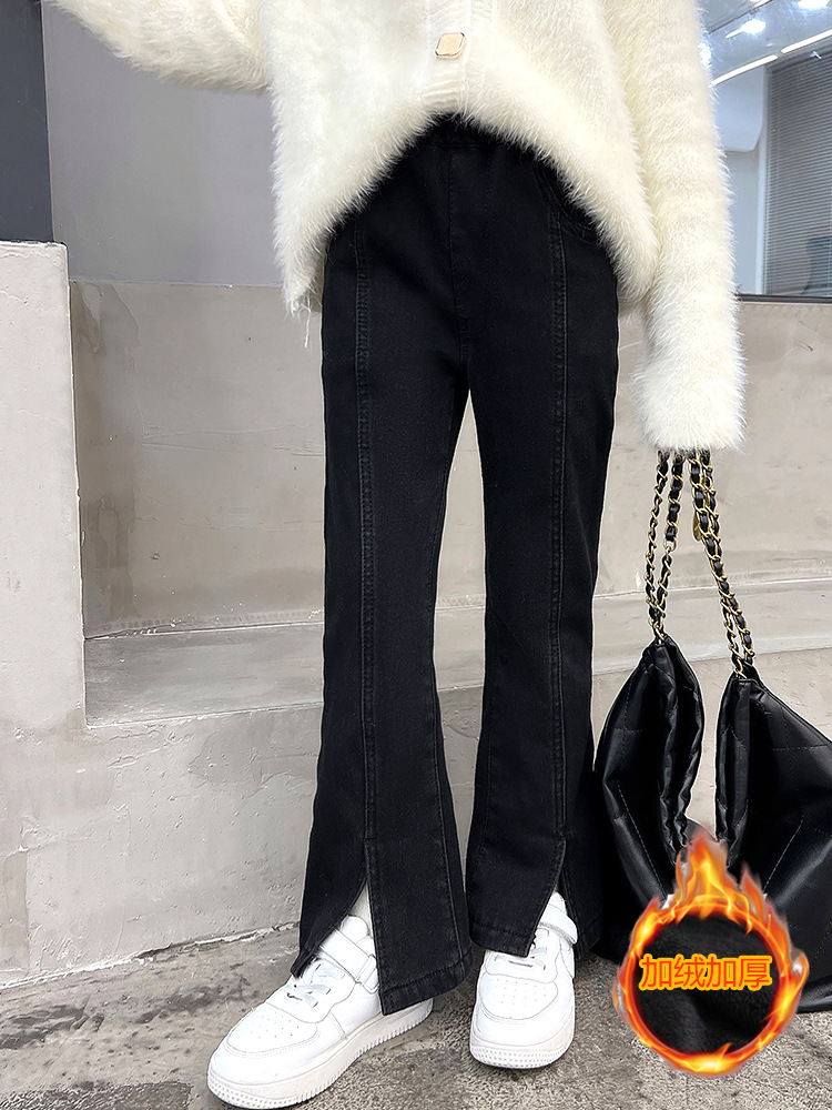 소녀 기모 청바지 가을과 겨울 분할 어린이 유행 인터넷-유명한 외국식 슬리밍 소녀의 올매치 트렌디 마이크로 플레어 바지스토어 가기
