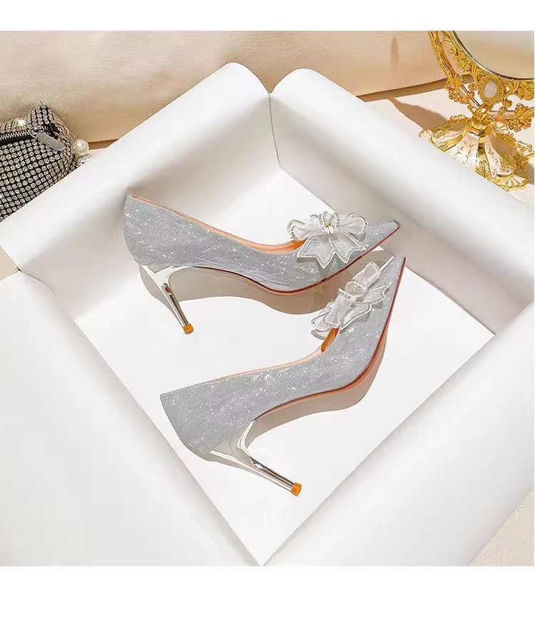 공장 직접 하이힐 여성의 얇은 발 뒤꿈치 2024 봄과 가을 새로운 활 웨딩 신발 여성 실버 신부 들러리 신발 하이힐스토어 가기