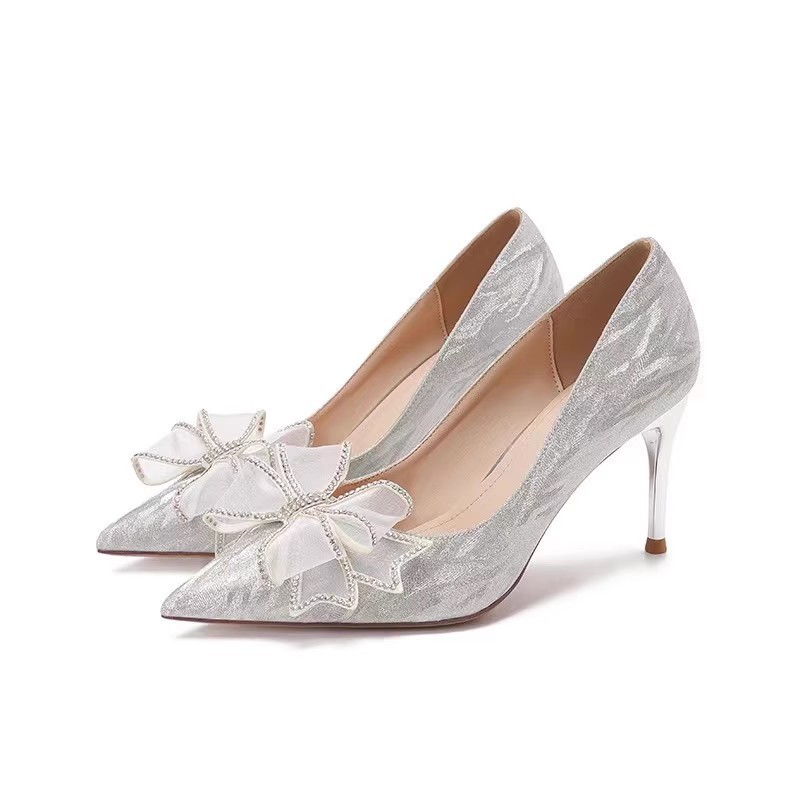공장 직접 하이힐 여성의 얇은 발 뒤꿈치 2024 봄과 가을 새로운 활 웨딩 신발 여성 실버 신부 들러리 신발 하이힐