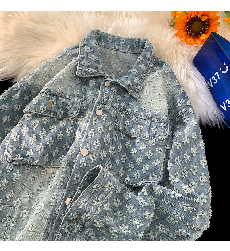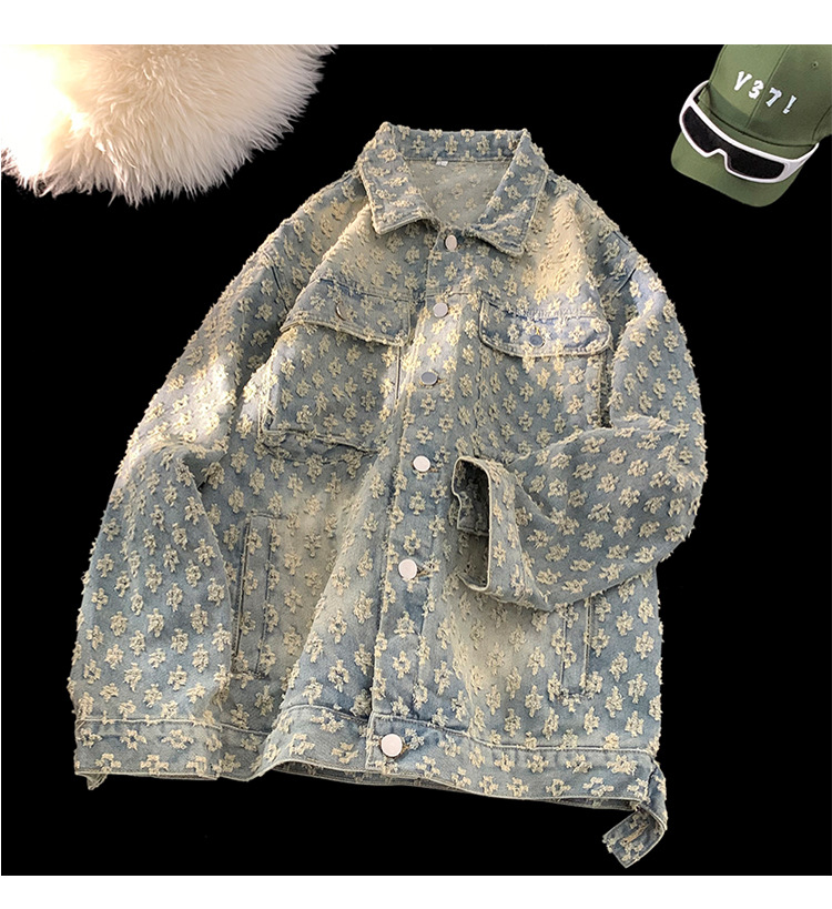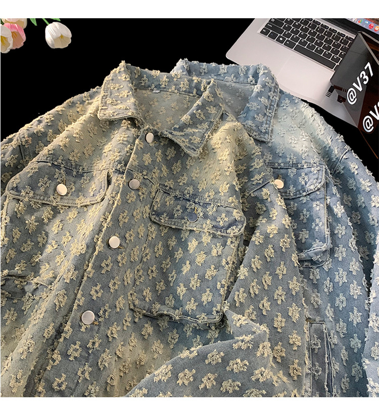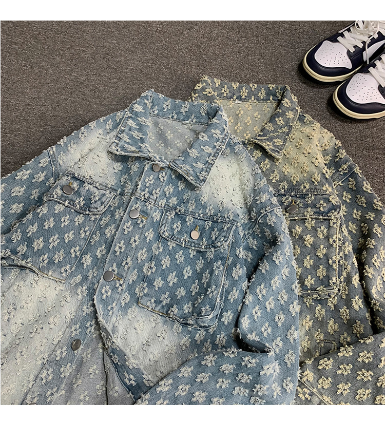 국경 간 남성 패션 브랜드 빈티지 세탁 오래 된 자카드 데님 재킷 느슨한 캐주얼 올 매치 풀 프린트 커플 재킷