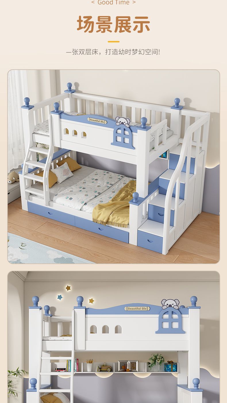• 파란색과 흰색 분할 코알라 + 이중 사다리 + 책장 + 서랍 + 매트리스 + 설치