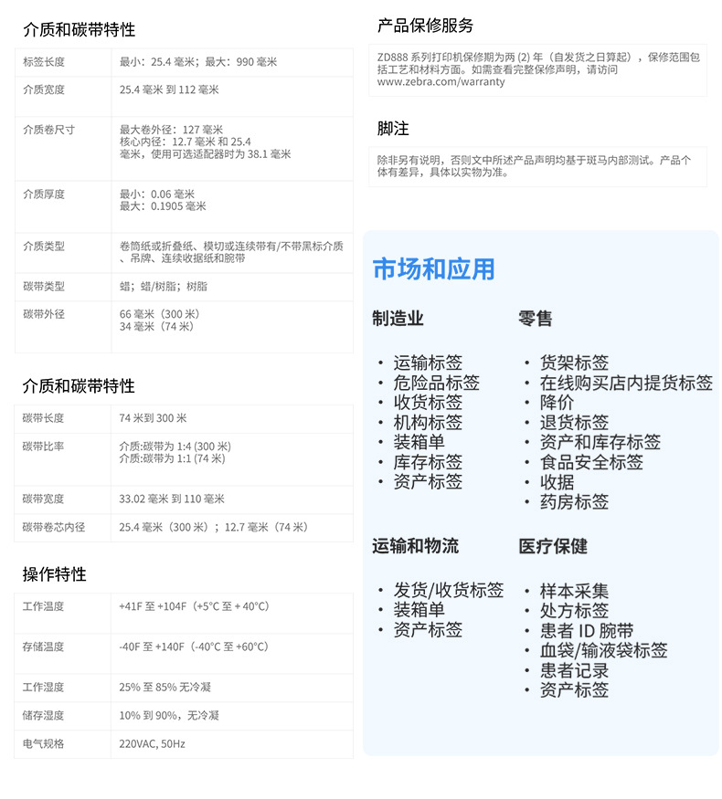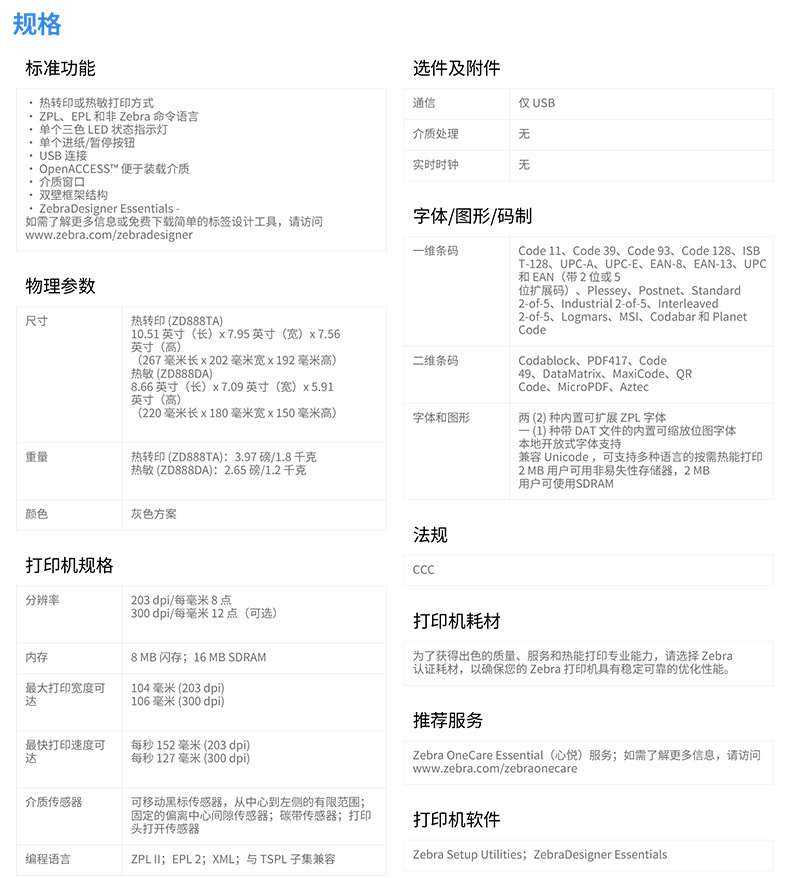 • ZD888t/203dpi(흰색 버전은 70m 리본만 지원합니다)