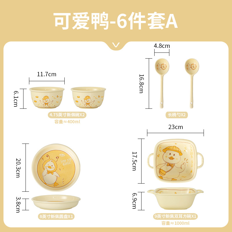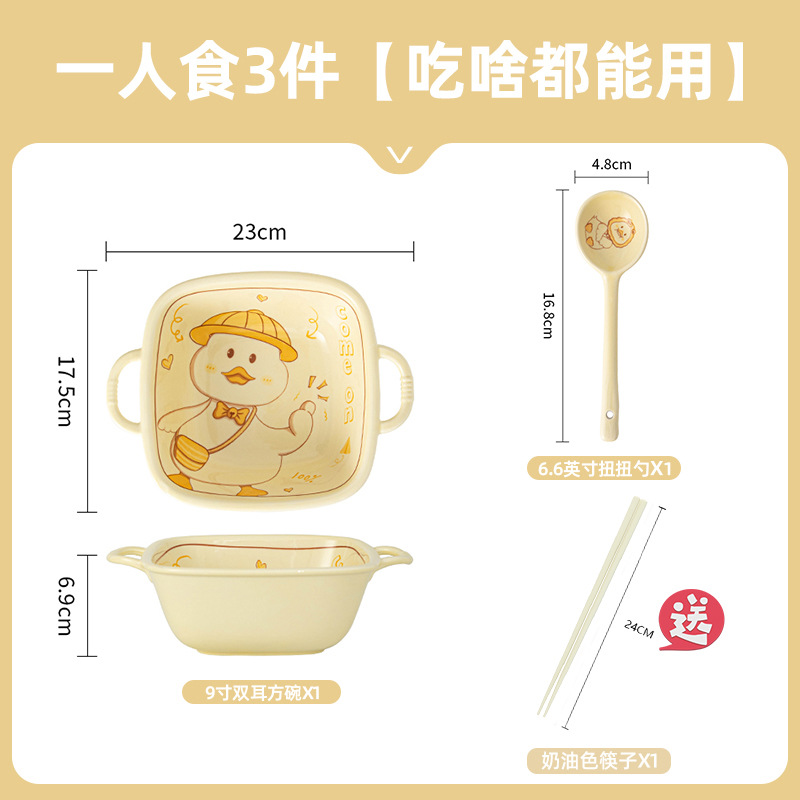 귀여운 오리 만화 세라믹 그릇과 접시 세트 가정용 밥 그릇 크림 스타일 1 인 식기 그릇 및 젓가락 세트