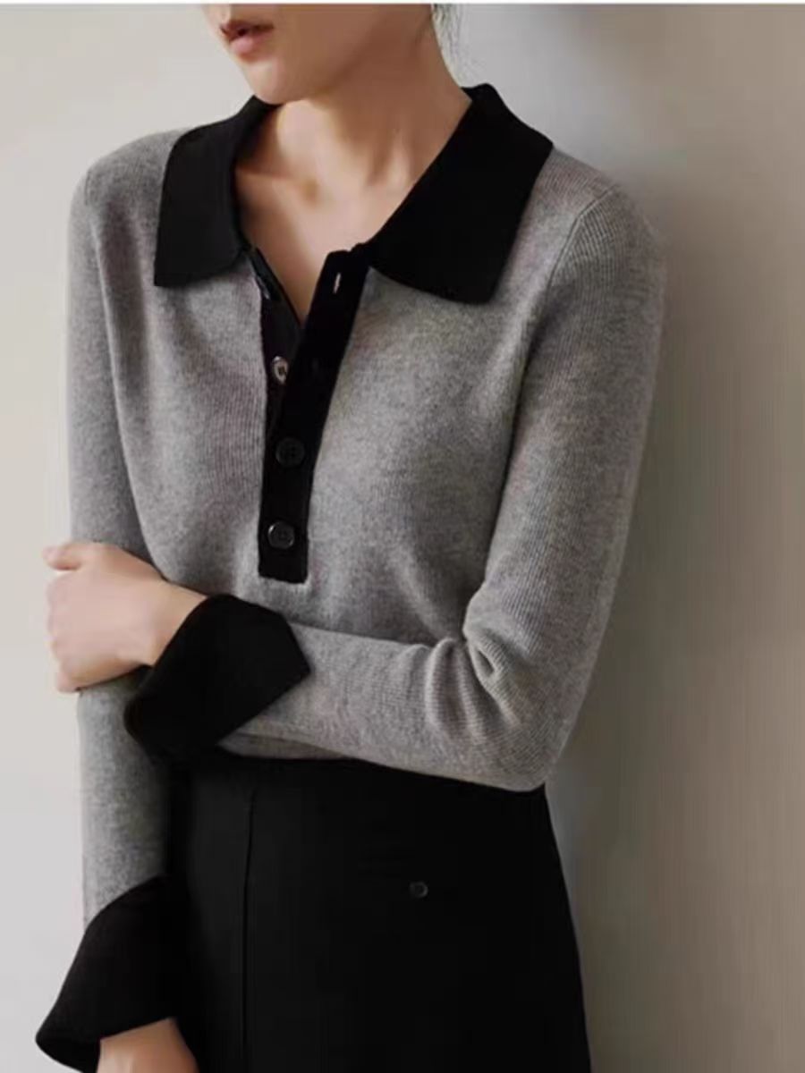 가을과 겨울 새로운 울 스웨터 여성의 POLO 칼라 유럽 슬림 핏 스웨터 옷깃 풀오버 대비 컬러 니트베이스 셔츠 탑