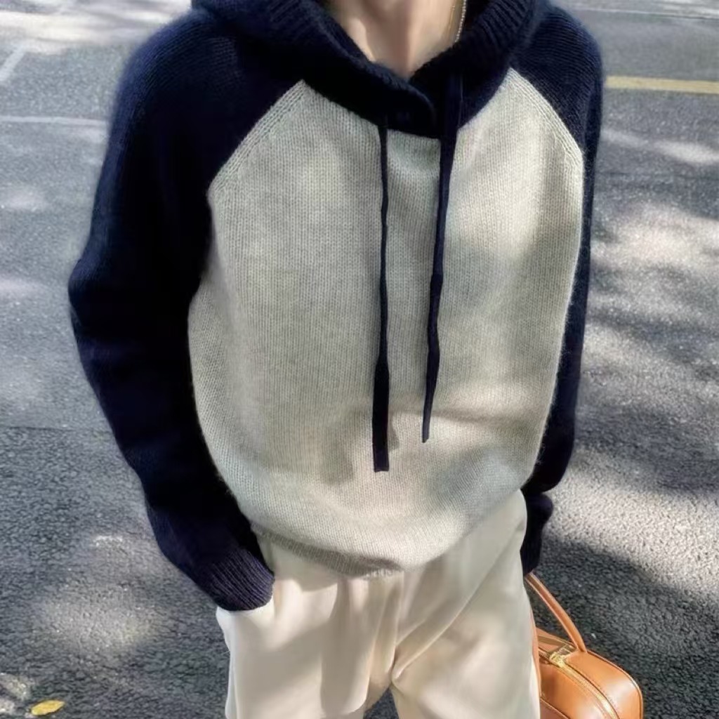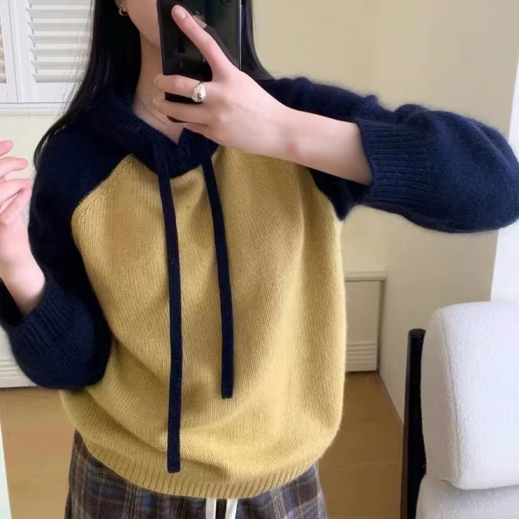 가을과 겨울 새로운 양모 후디 여성용 아우터 컬러 매칭 풀오버 에이지 감소 스웨터 루즈 두꺼운 후드 스웨터
