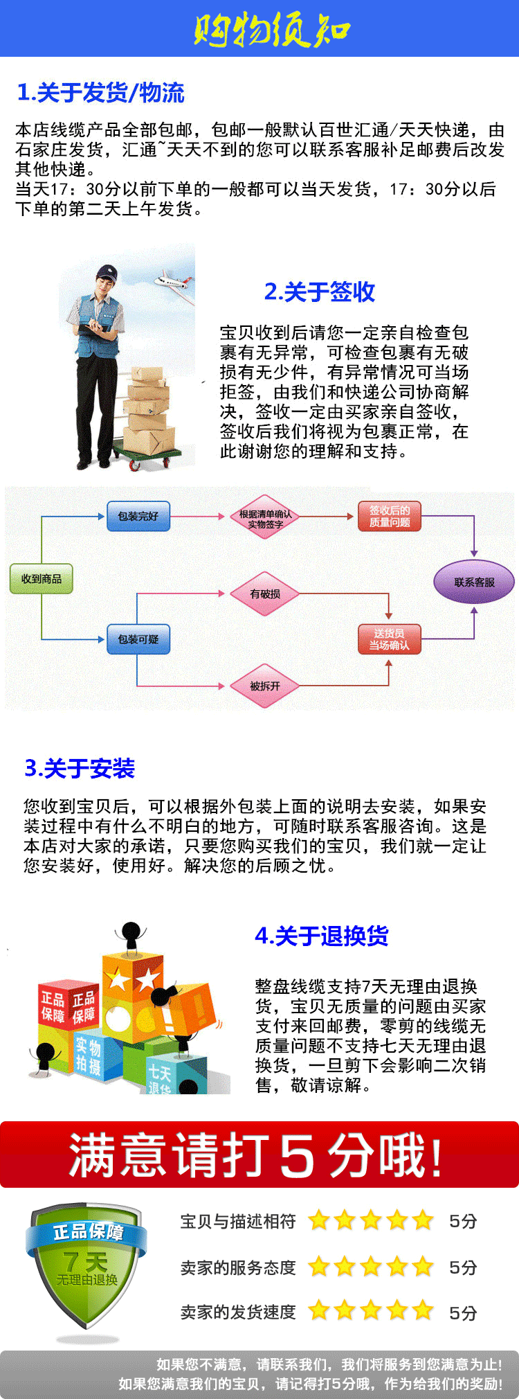 没有华丽的语言,也没有美工PS,有的只是实实在在的描述,本店线缆图片都是店主自己拍摄的,没有修图,也没有美化,保证您收到宝贝和图片是一模一样的。
