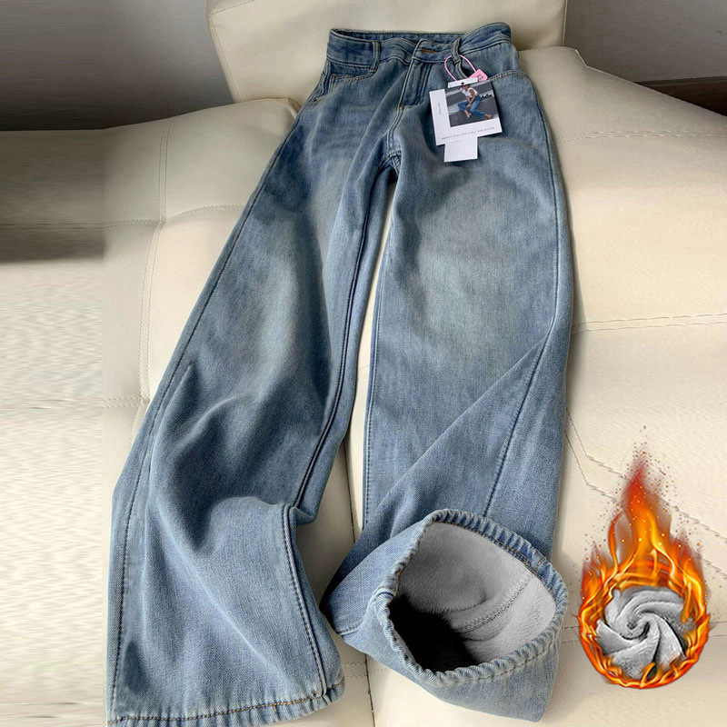 좁은 레트로 블루 넓은 다리 바닥 바지 따뜻한 기모 느슨한 올매치 두꺼운 높은 허리 스트레이트 데님 바지스토어 가기