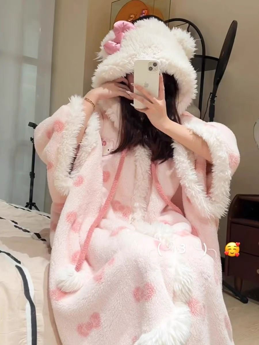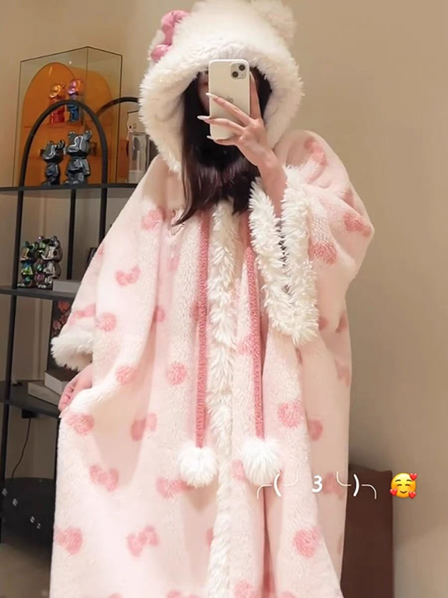 귀여운 소녀 부드러운 소녀 활 산호 벨벳 후드 잠옷 잠옷 겨울 2025 새로운 벨벳 따뜻한 망토