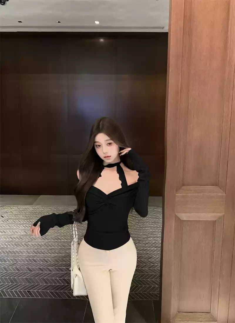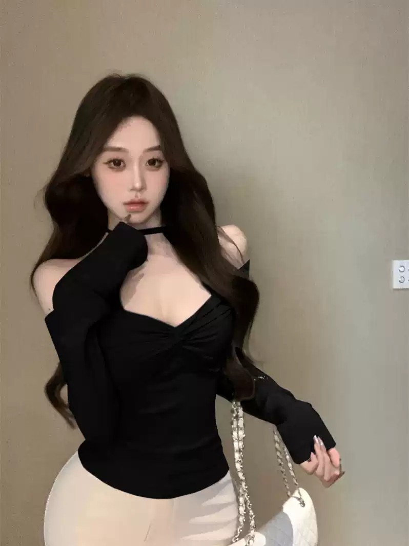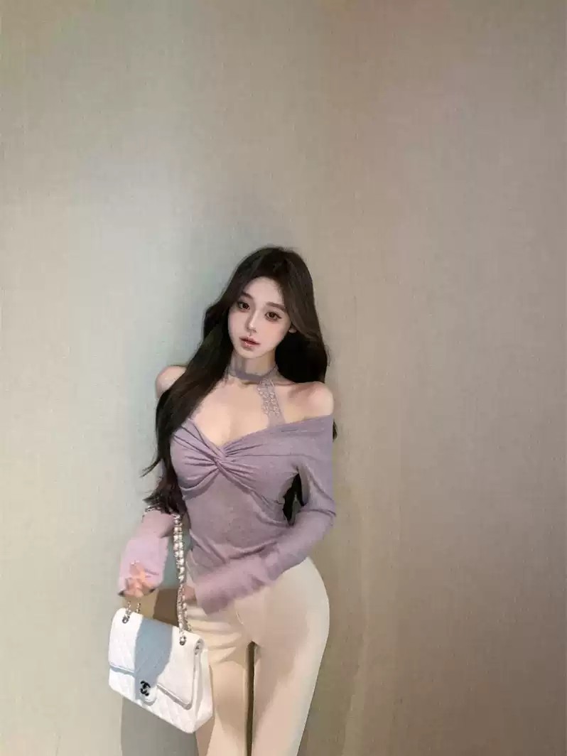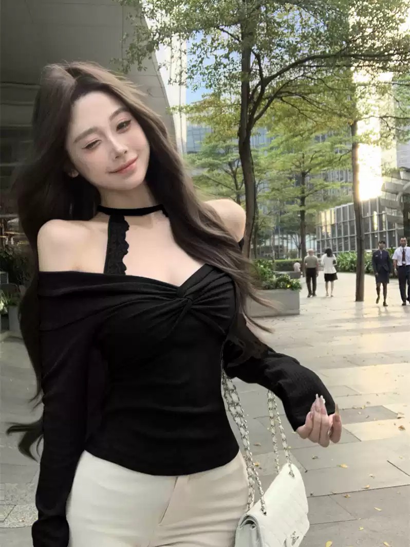 원숄더 레이스 홀터넥 긴팔 티셔츠, 원숄더 넥라인, 가을 슬림핏 트위스트 디자인, 퍼플 숏 기장 이너웨어스토어 가기