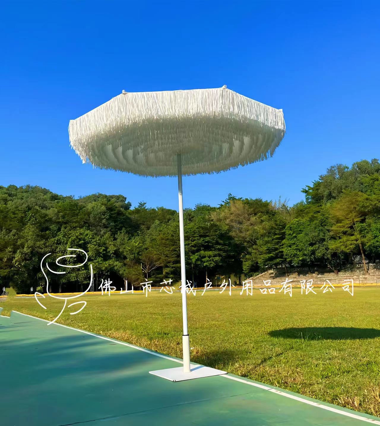 호텔 테라스 실내 및 실외 장식품 Tassel 중간 칼럼 우산 코트야드 알루미늄 합금 우산 랙 인공 잔디 야외 햇빛 우산