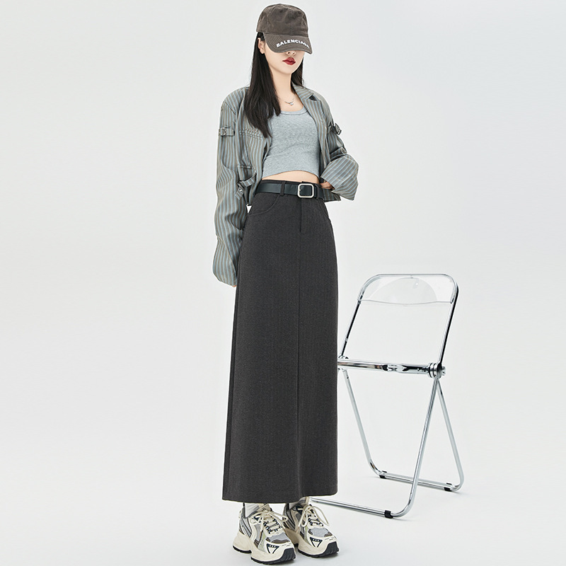 두꺼운 모직 세트 스커트 여성의 가을과 겨울 새로운 높은 허리 슬리밍 스트레이트 스플릿 긴 엉덩이 긴 스커트