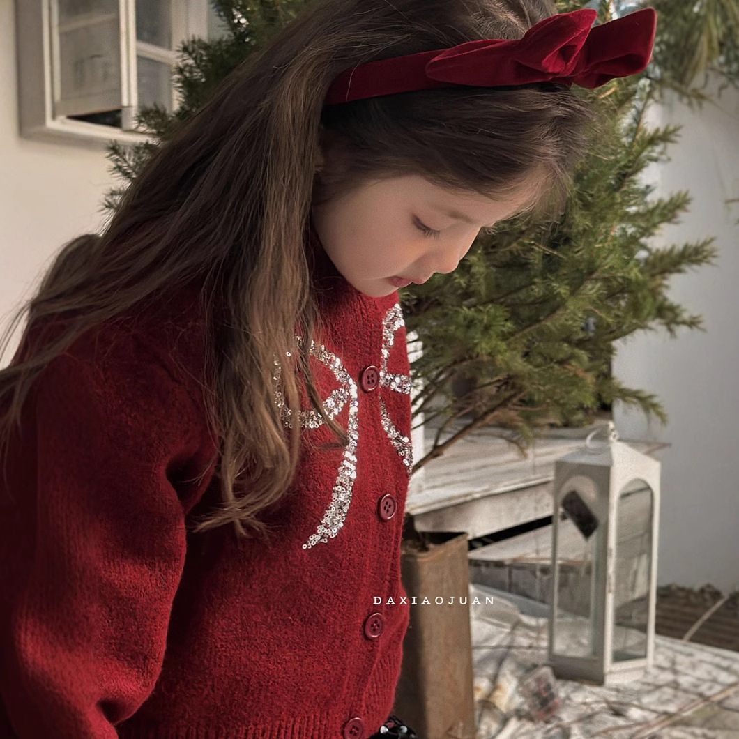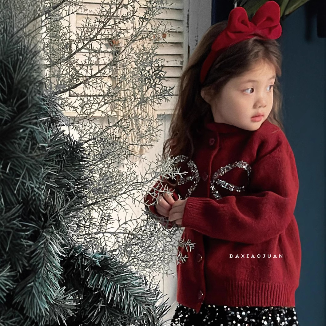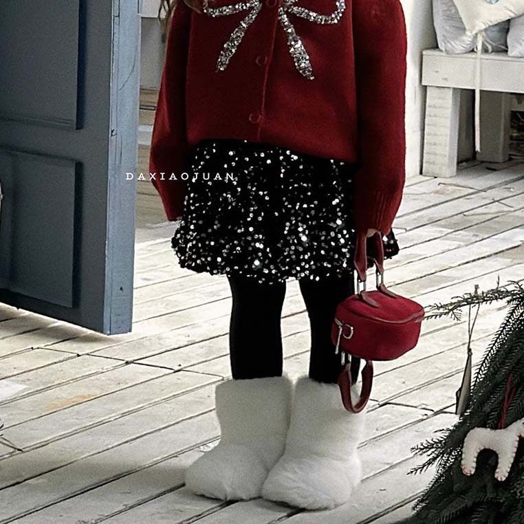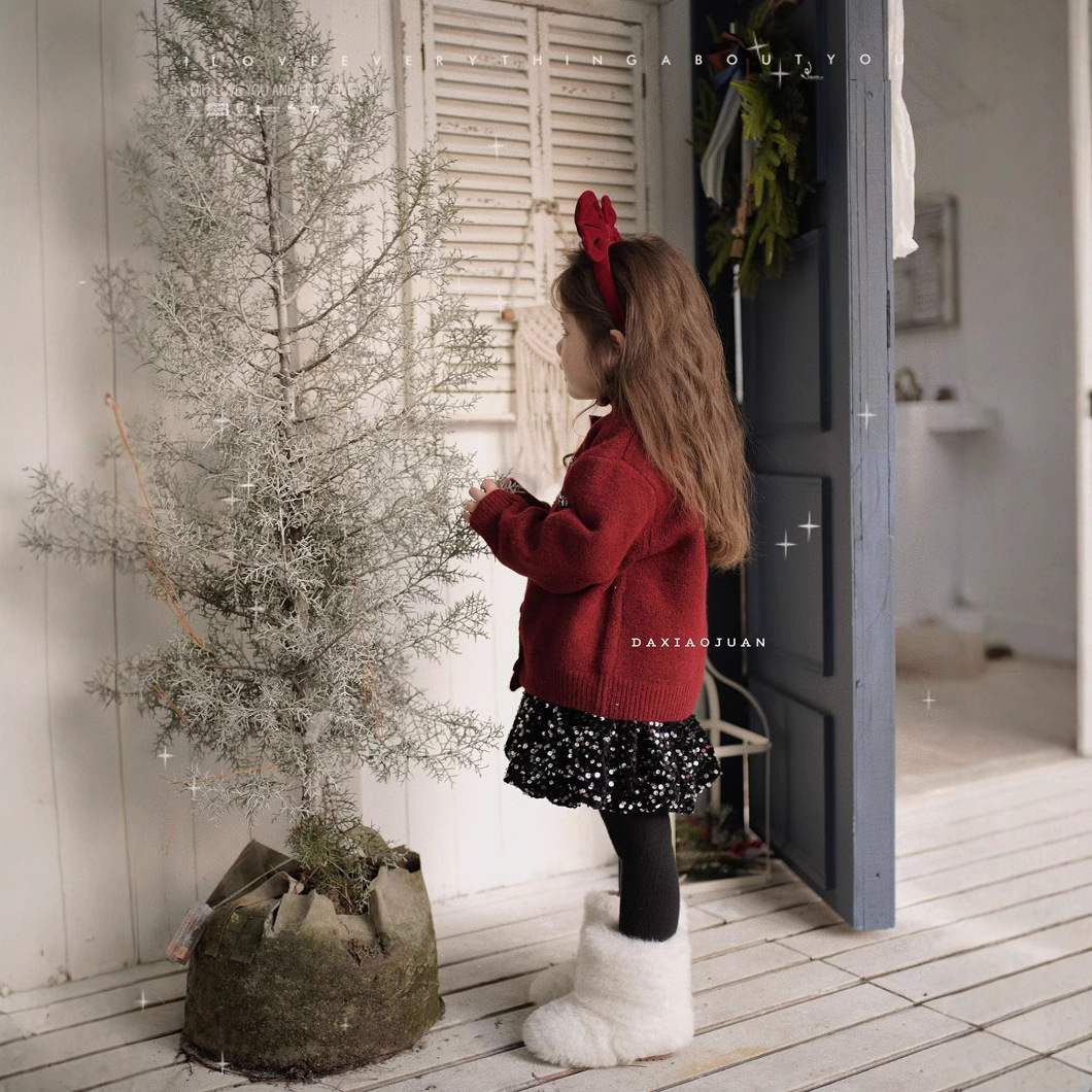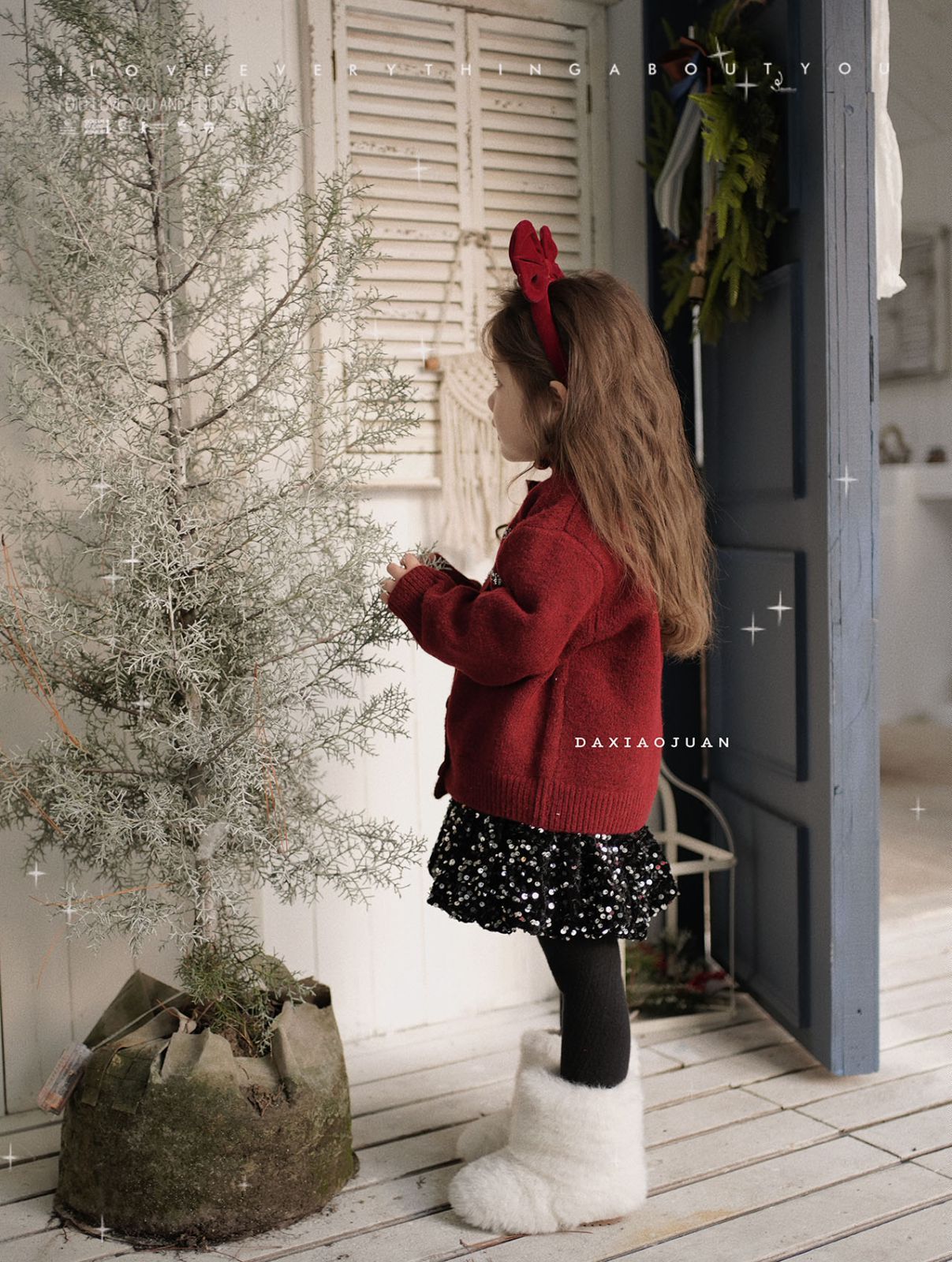 사이즈 롤 [소프트 하트 퍼프] 겨울 소녀 따뜻한 두꺼운 빨간 스웨터 코트 활 스팽글 스커트 7066