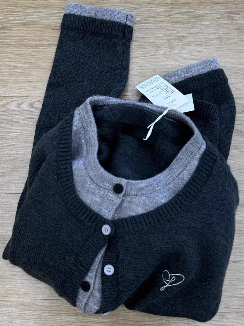 여성을위한 그레이 가짜 투피스 니트 스웨터 재킷 2025 가을, 겨울 새로운 짙은 회색 하이 엔드 스플 라이스 탑스토어 가기