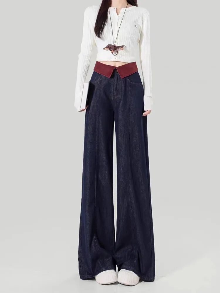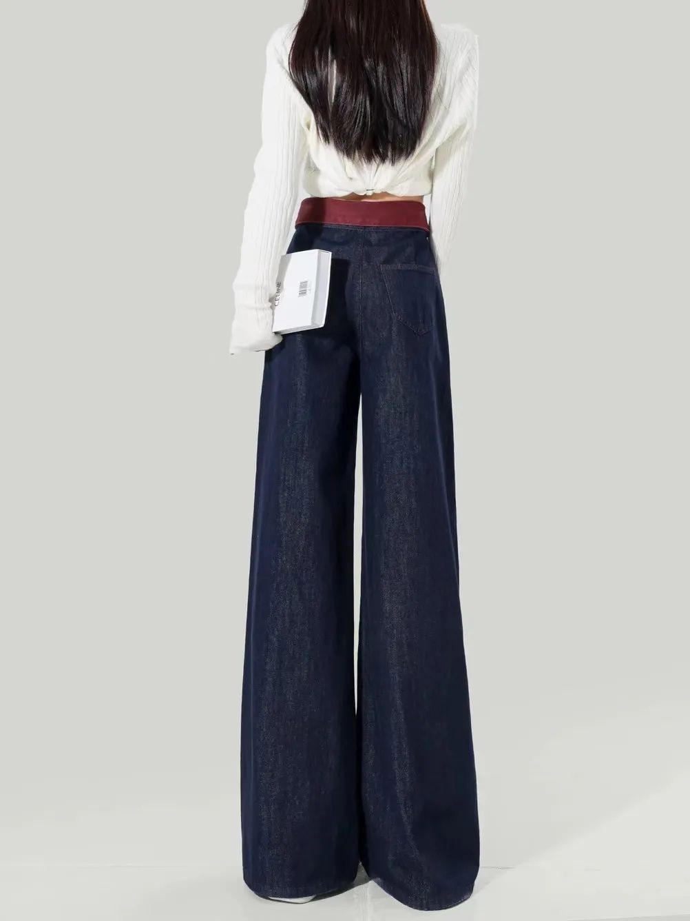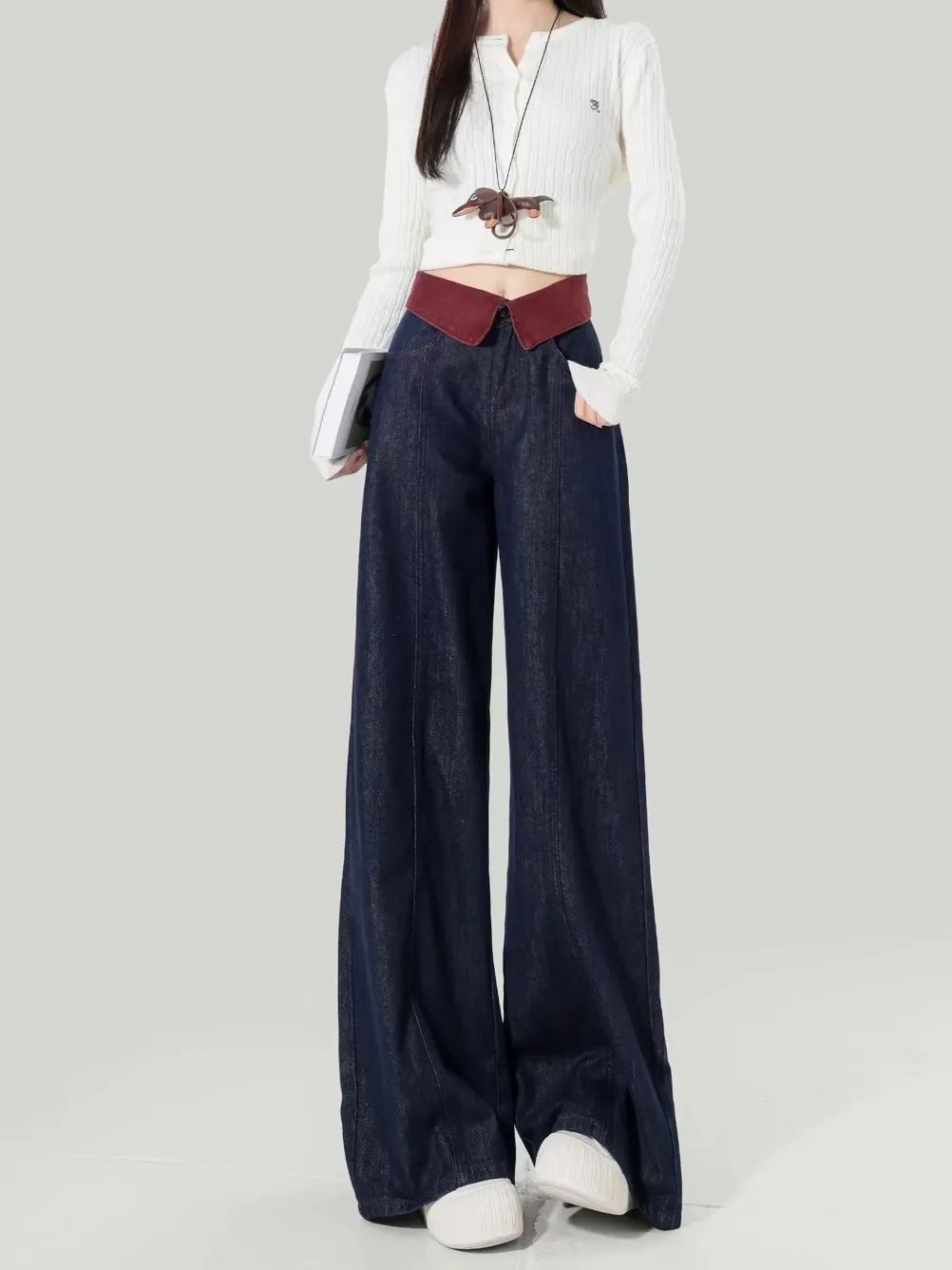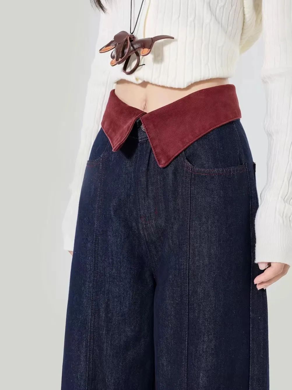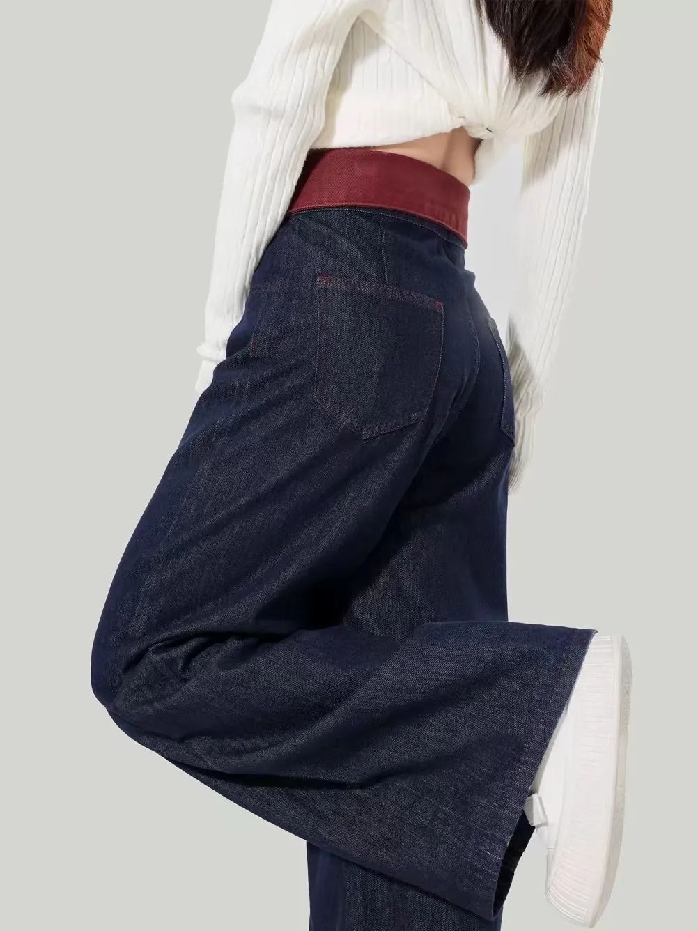 아메리칸 스타일 레트로 높은 허리 넓은 다리 청바지 여성의 2024 가을과 겨울 새로운 스티칭 디자인 감각 느슨한 덤핑 바지