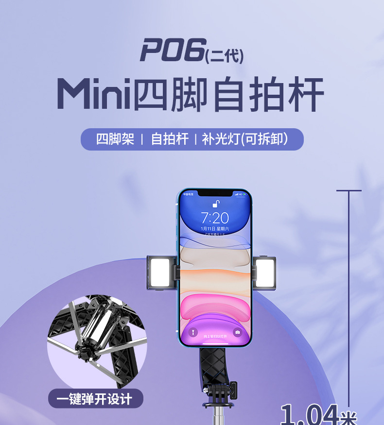 • P06 2세대-V1/휴대폰 셀카봉/화이트/싱글라이트/팝업 없음