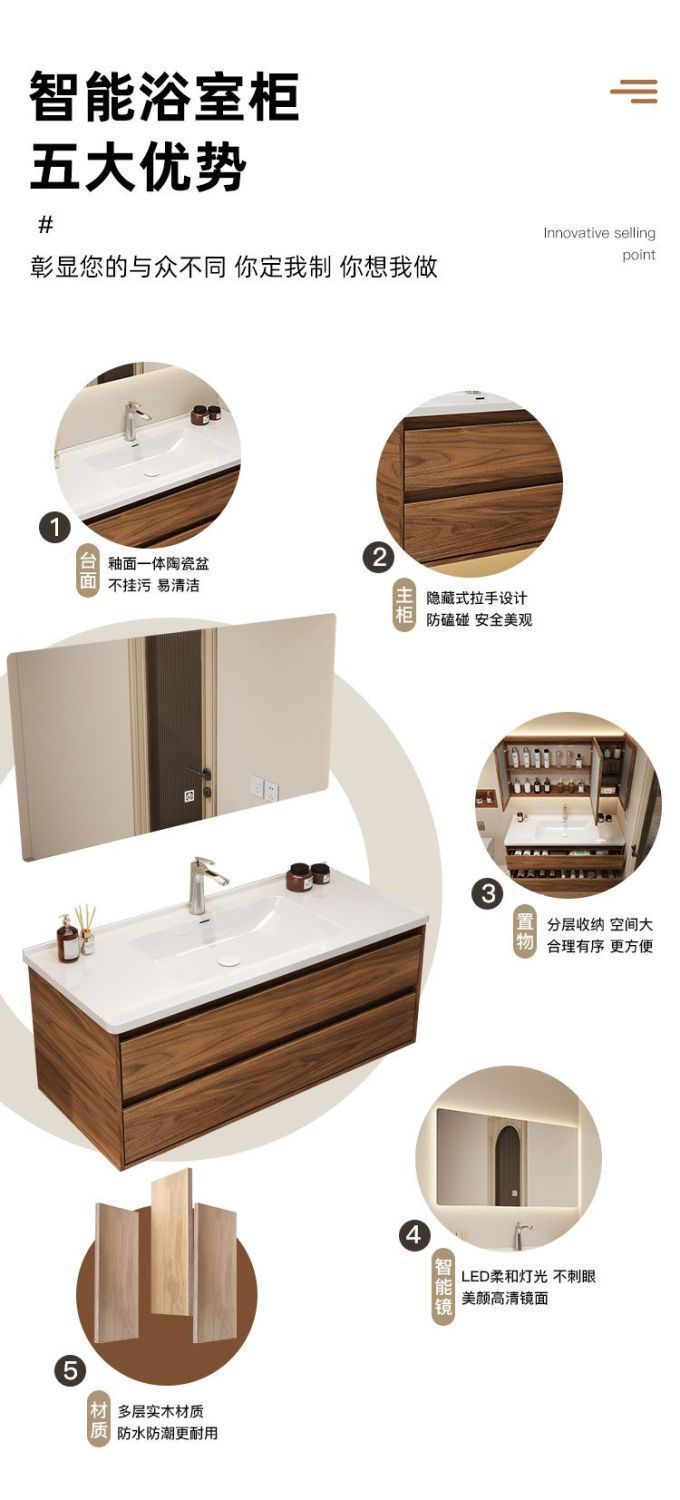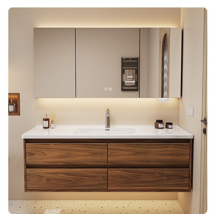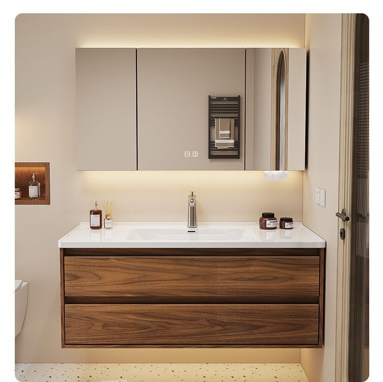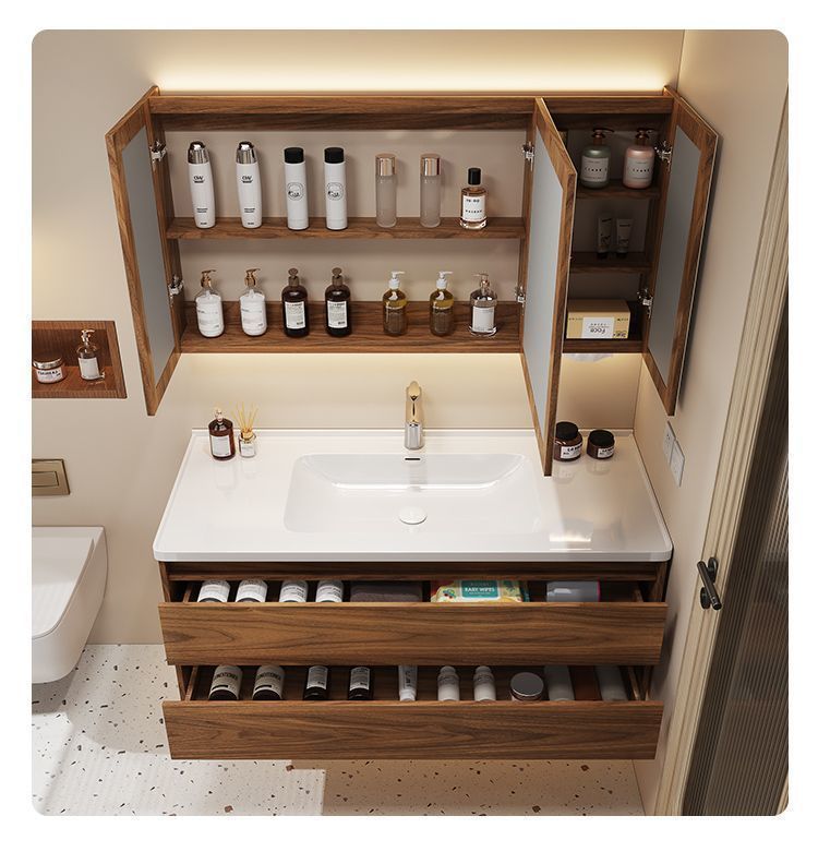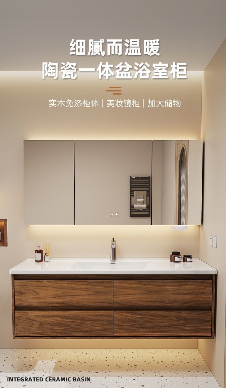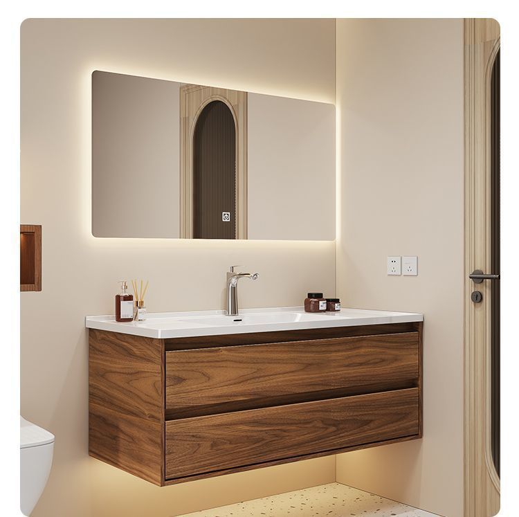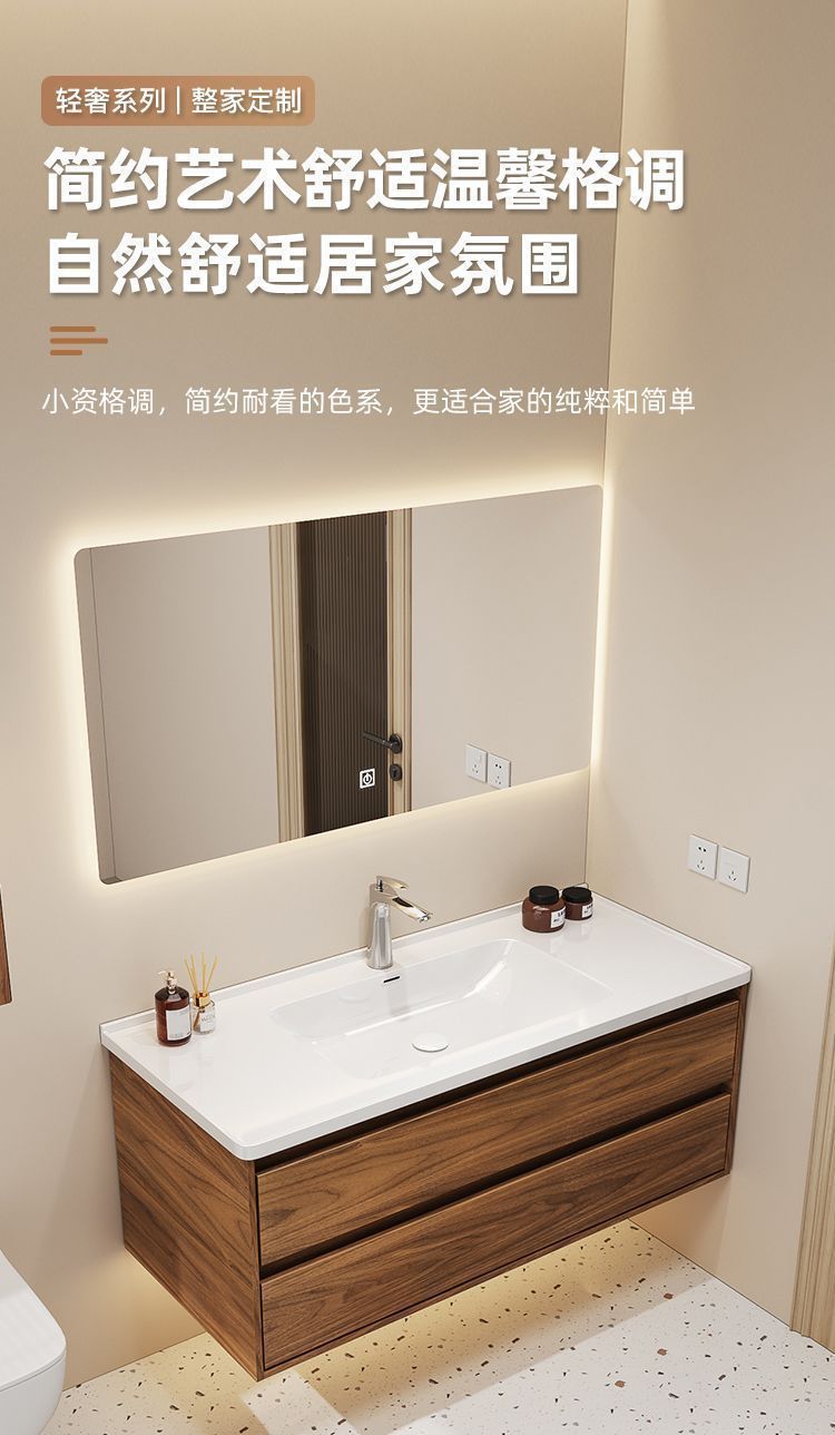 세면대 호두 나무 컬러 더블 서랍 욕실 캐비닛 욕실 세척 세라믹 통합 세면대 조합 장식품스토어 가기