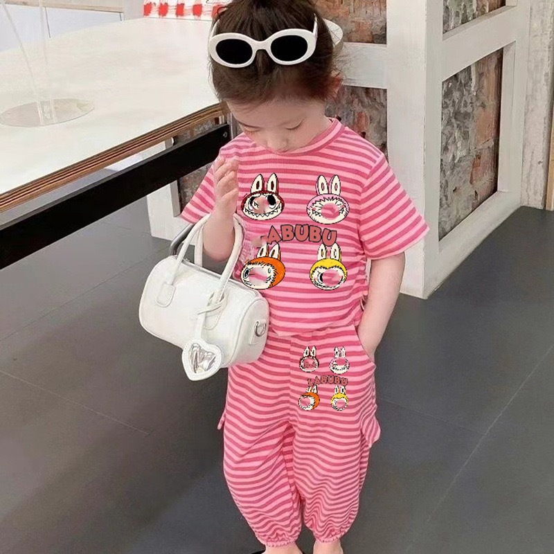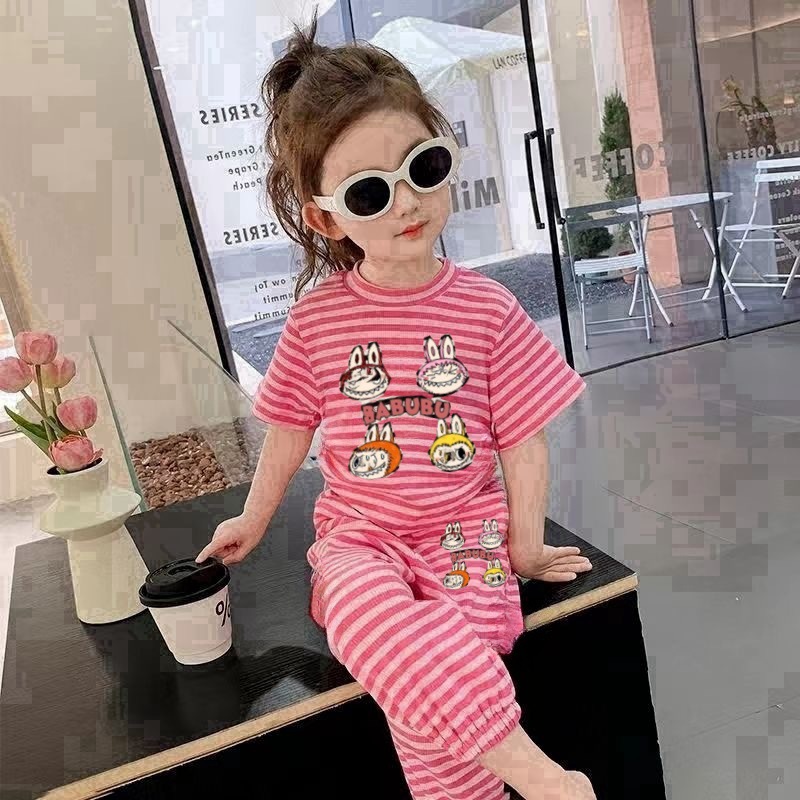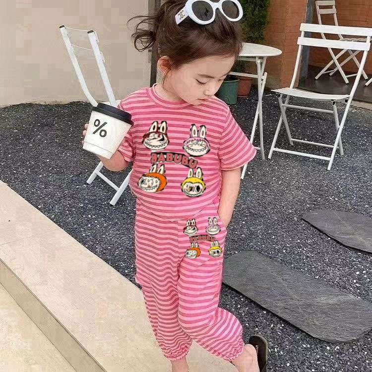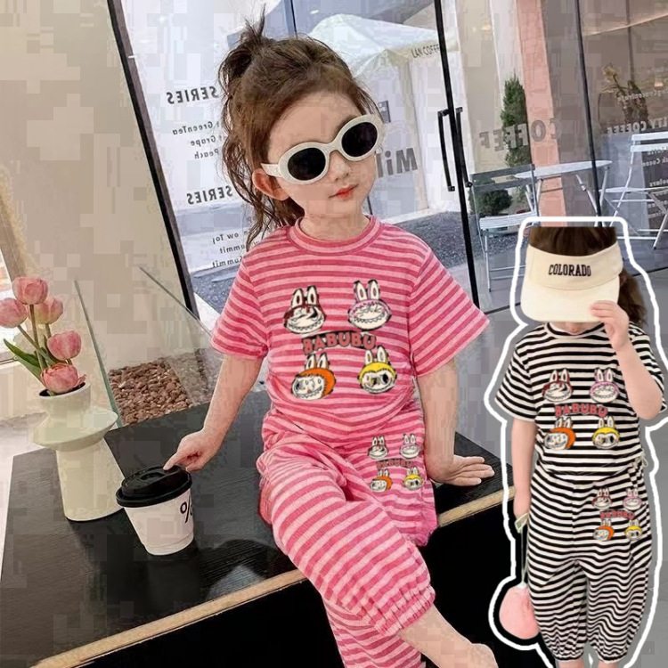 여자 세트 스타일스터 어린이 반팔 2024 새로운 어린이 캐주얼 스트라이프 티셔츠 귀여운 소녀의 투피스 세트스토어 가기
