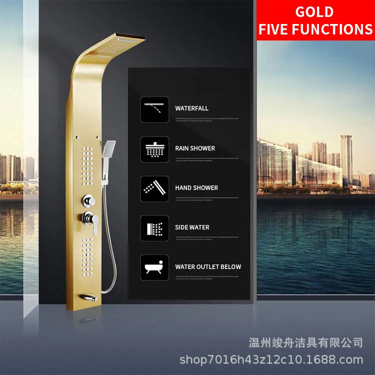 • V 스타일 티타늄 골드 샤워 스크린 5가지 기능 304 스테인레스 스틸 표면 장착 샤워 헤드