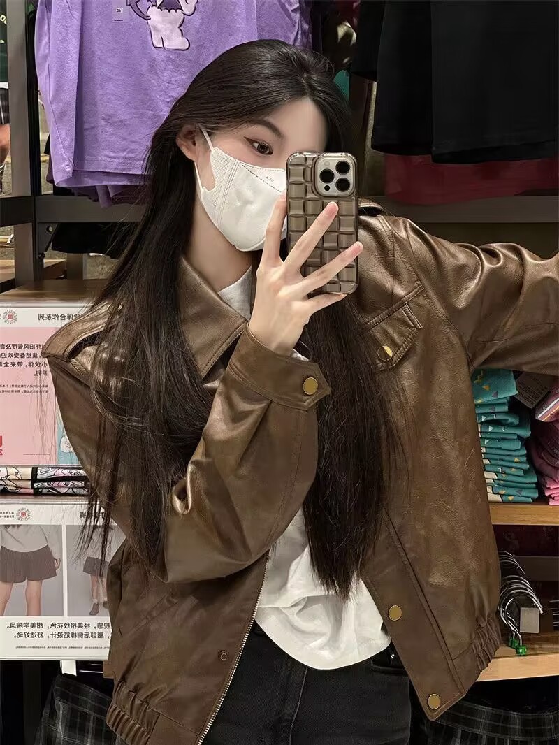 미국 복고풍 디자인 센스 틈새 오토바이 재킷 2025 새로운 봄과 가을 높은 감각 다크 브라운 PU 가죽 재킷