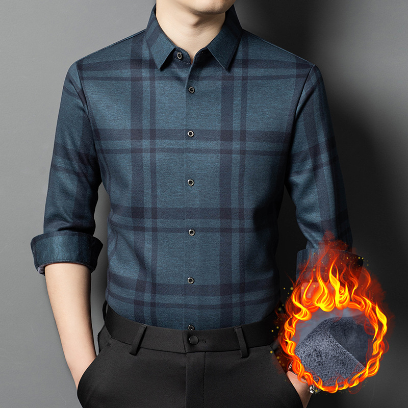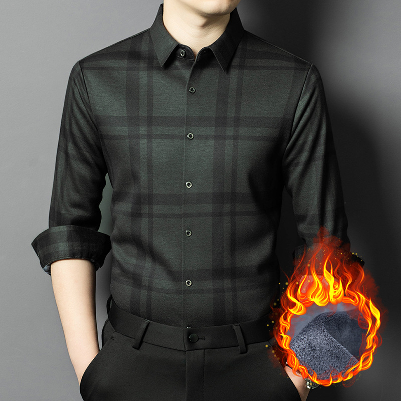 가을과 겨울 새 기모 원활한 플레이드 긴팔 셔츠 남성 비 다림질 비즈니스 캐주얼 베이스 셔츠