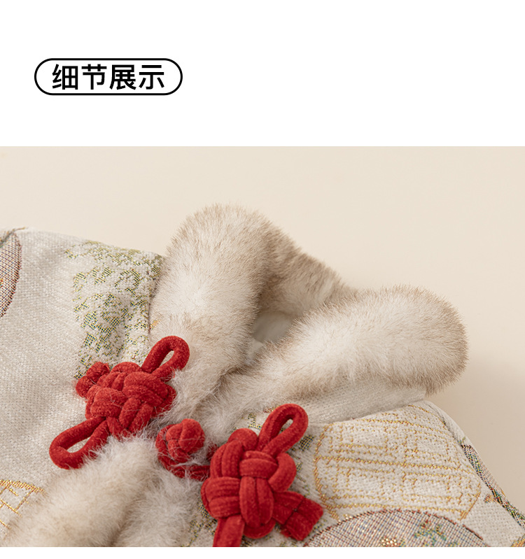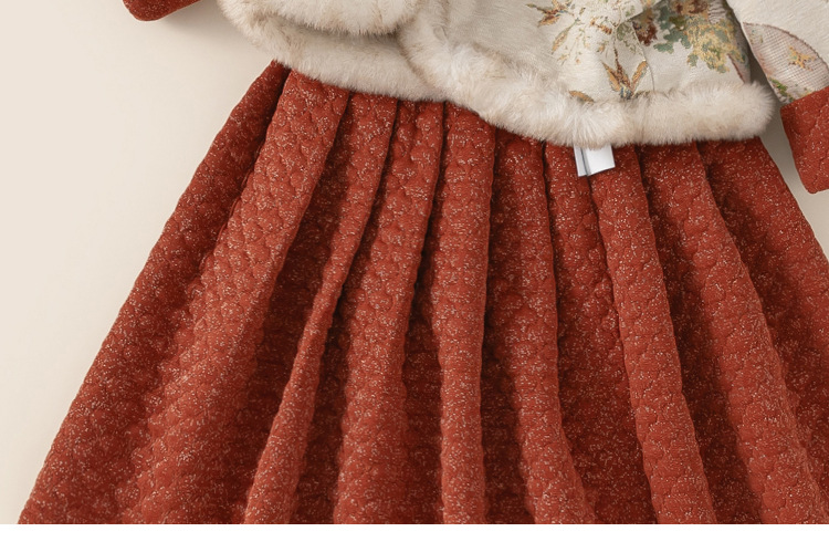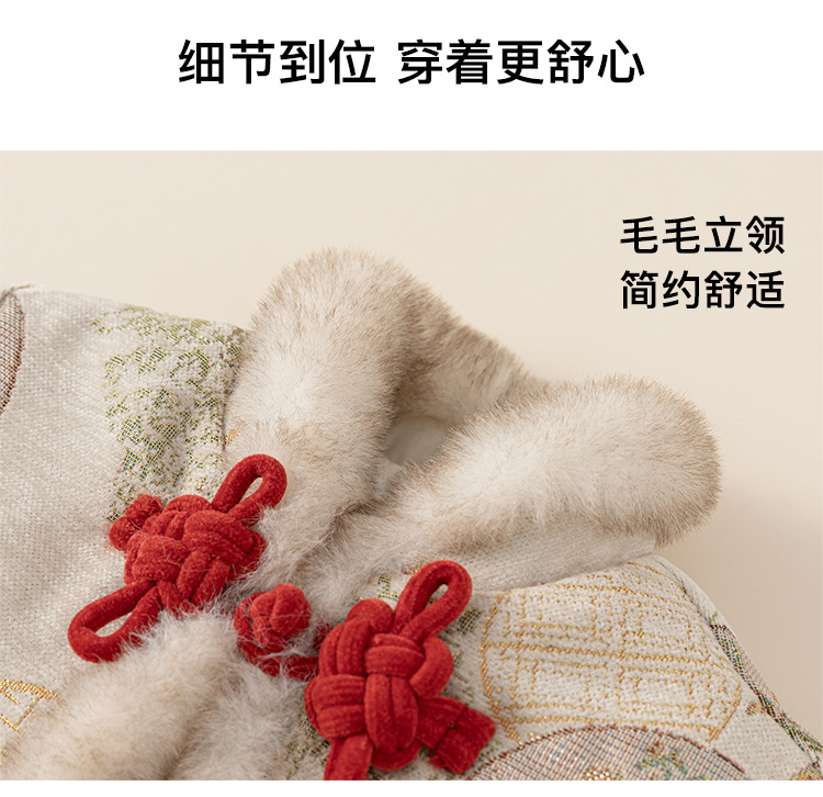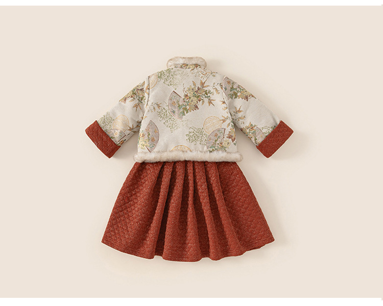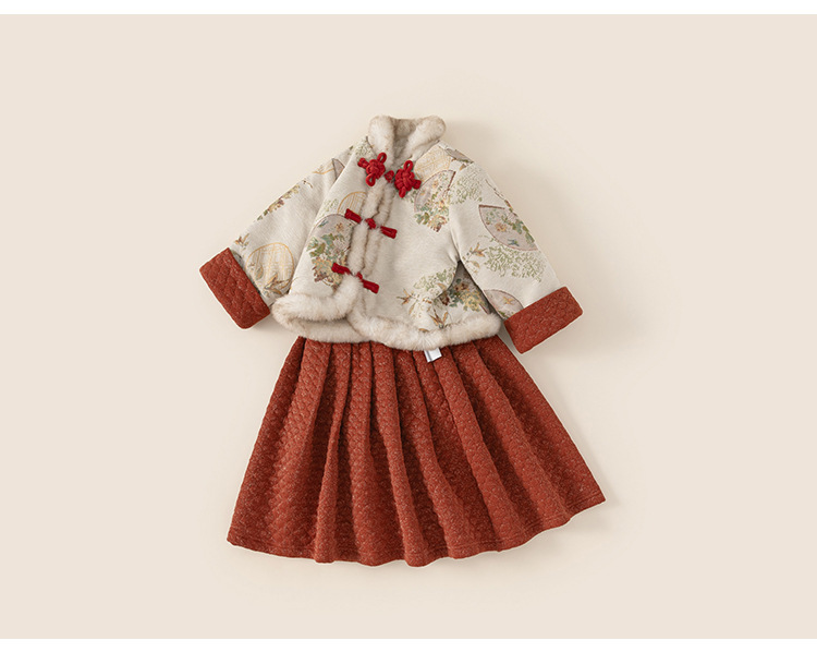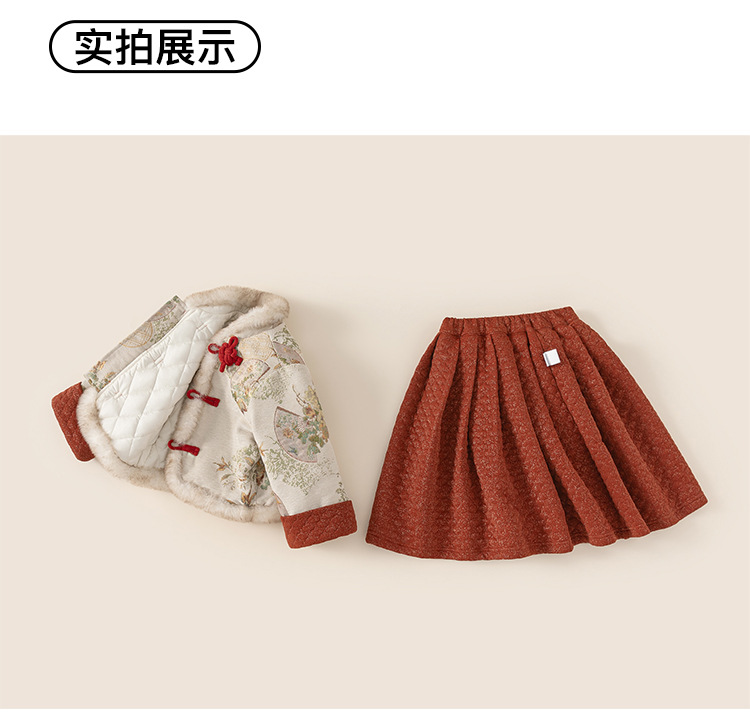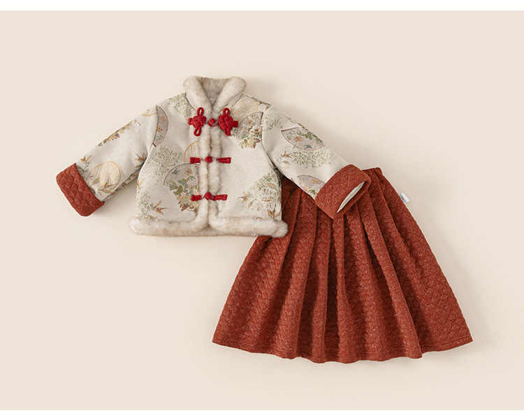 Bangxuan Girls의 새로운 중국 두꺼운 겨울 투피스 세트 어린이 Guofeng 자수 모피 가장자리 버튼 코트 세트 원피스스토어 가기