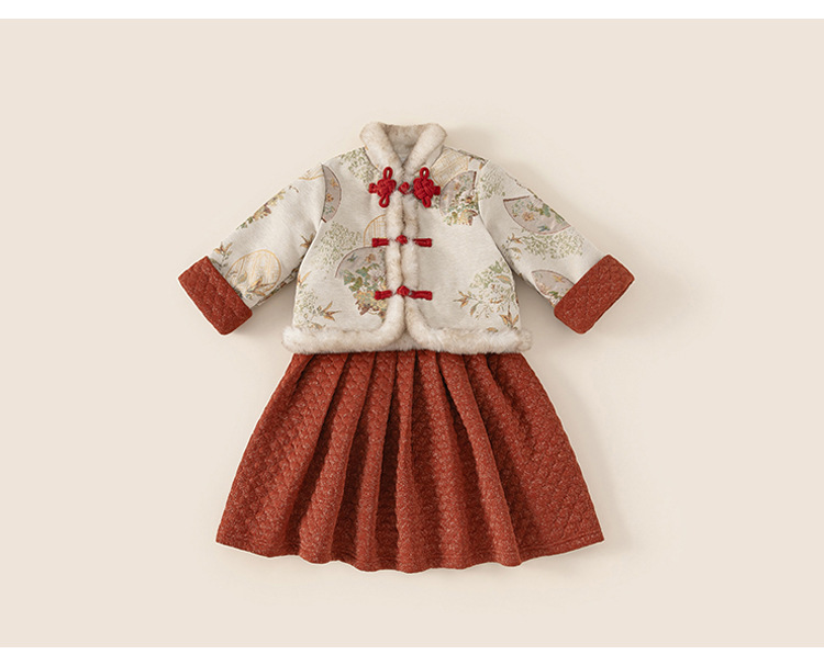 Bangxuan Girls의 새로운 중국 두꺼운 겨울 투피스 세트 어린이 Guofeng 자수 모피 가장자리 버튼 코트 세트 원피스