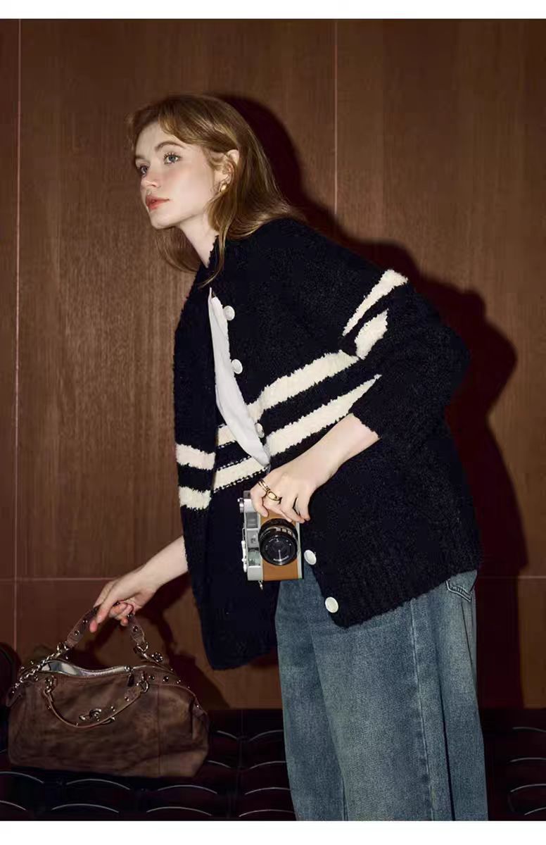 쿠엔의 부드럽고 두꺼운 니트 가디건 여성용 2025년 가을 겨울 신상 심플 스트라이프 스웨터 캐주얼 재킷